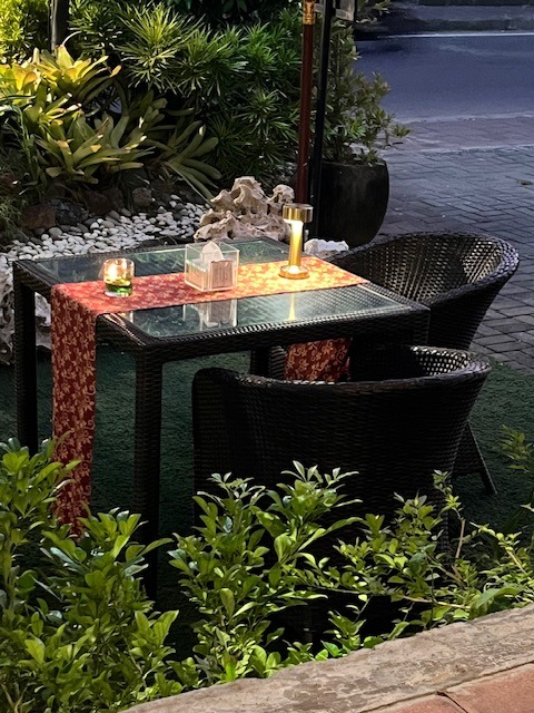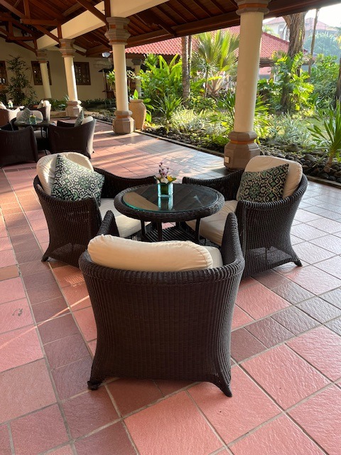 海外リゾートホテルには必ず置かれている雨にも強いシンセティックラタンのテーブルと椅子のセットです。