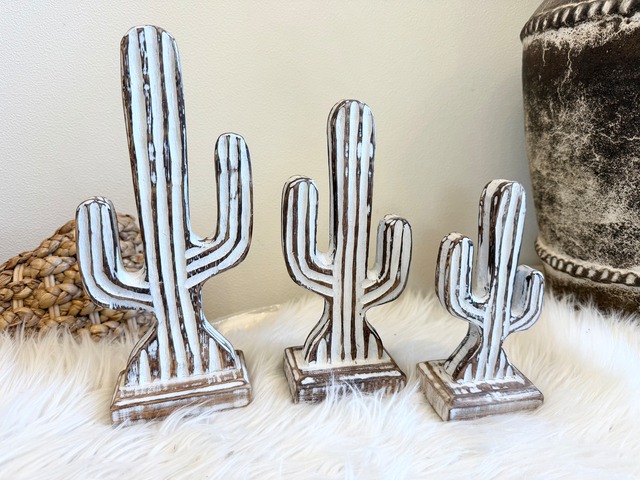 木製のサボテンの置物です。 ホワイトカラーが可愛く、他のインテリア雑貨と合わせやすい商品です。 sizeは L MSがございますので置く場所によってサイズを選んで頂けます。 【商品詳細】 生産国 インドネシア 素材 木 size 高さ18cm 横8cm 奥行き6cm ※注意事項※ 職人さんの手によって一つ一つ作られたハンドメイド商品の為、 size、形、に若干の個体差がある場合がございます。予めご了承ください。