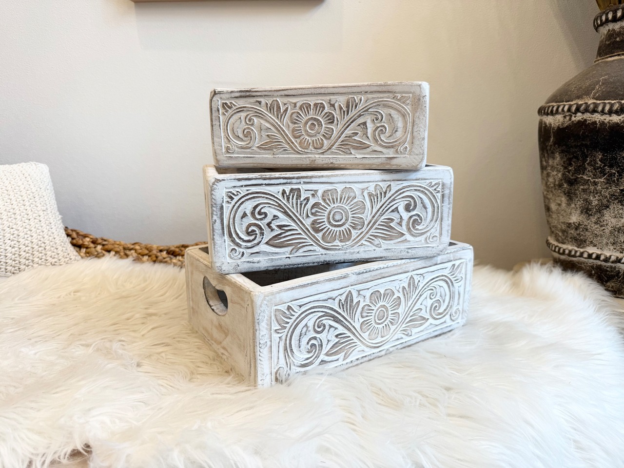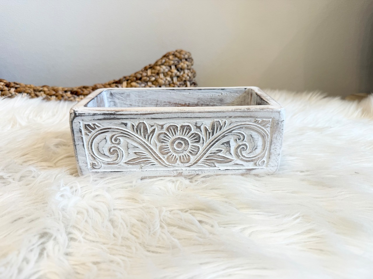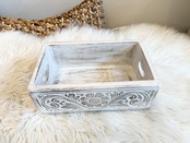 この木製のカービングが施されたボックスは、ハートのデザインの持ち手がとても可愛らしく、使うたびに笑顔になります。Lサイズなので、収納力も抜群で、様々なアイテムを整理整頓するのに最適です。お部屋のどこに置いても、ナチュラルでおしゃれな雰囲気を演出します!