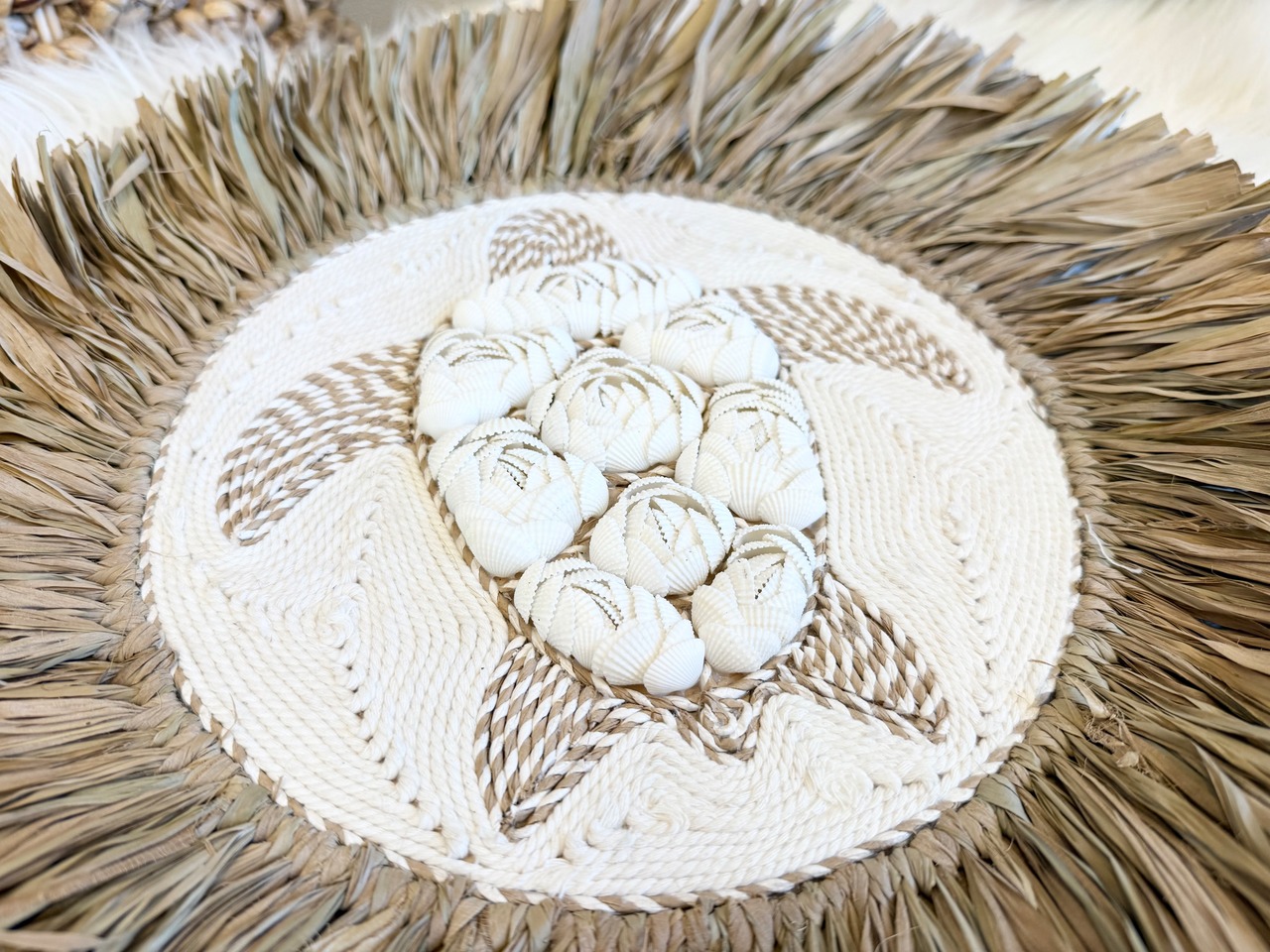 このウォールハンギングは、ラフィアとマクラメ、シェルを巧みに組み合わせたおしゃれなアイテムです。カメを中心にデザインされた可愛らしい姿が、どんなお部屋でもアートのような存在感を放ちます!壁に飾ることでお部屋に海の雰囲気を演出し、リラックスした空間を作り出します。