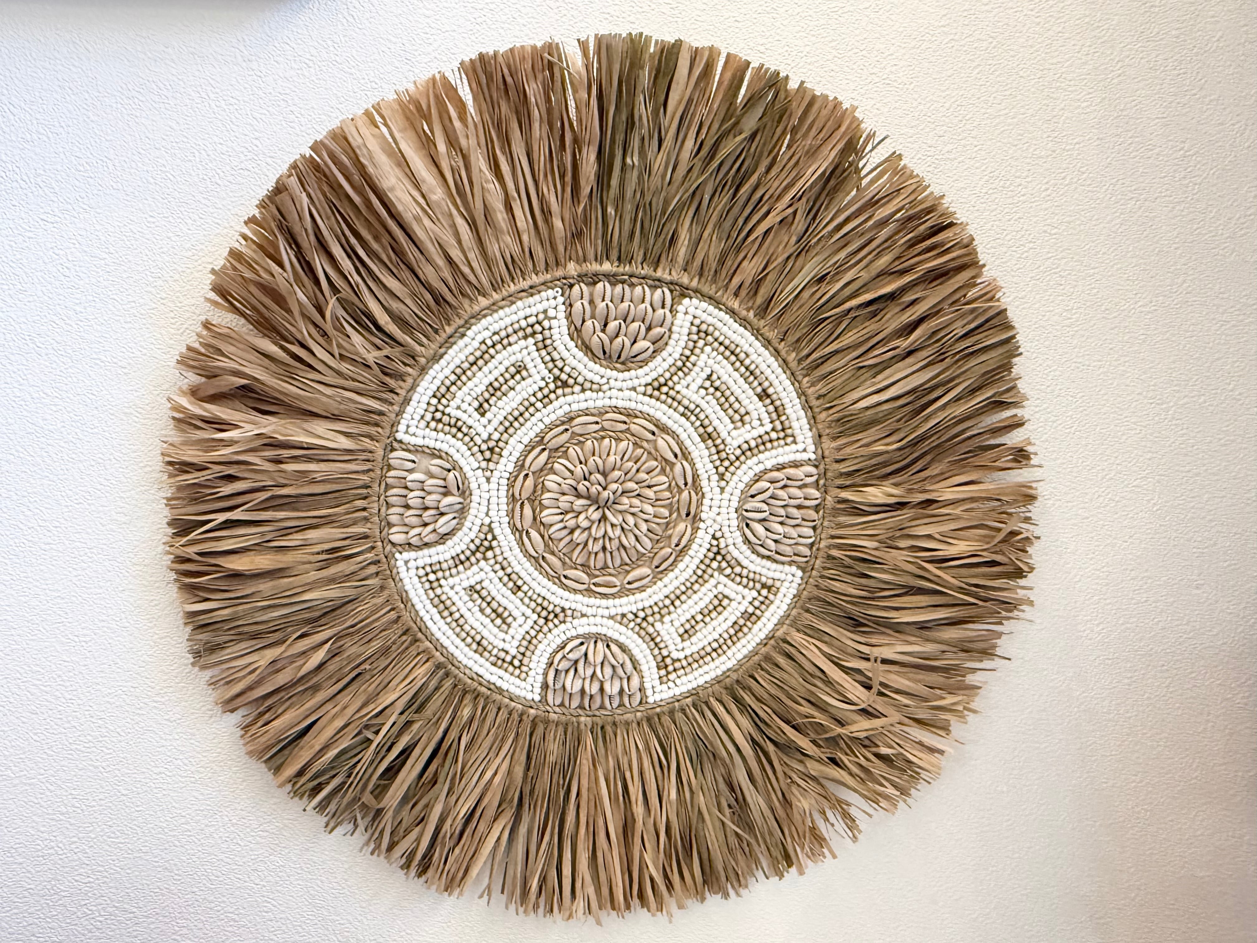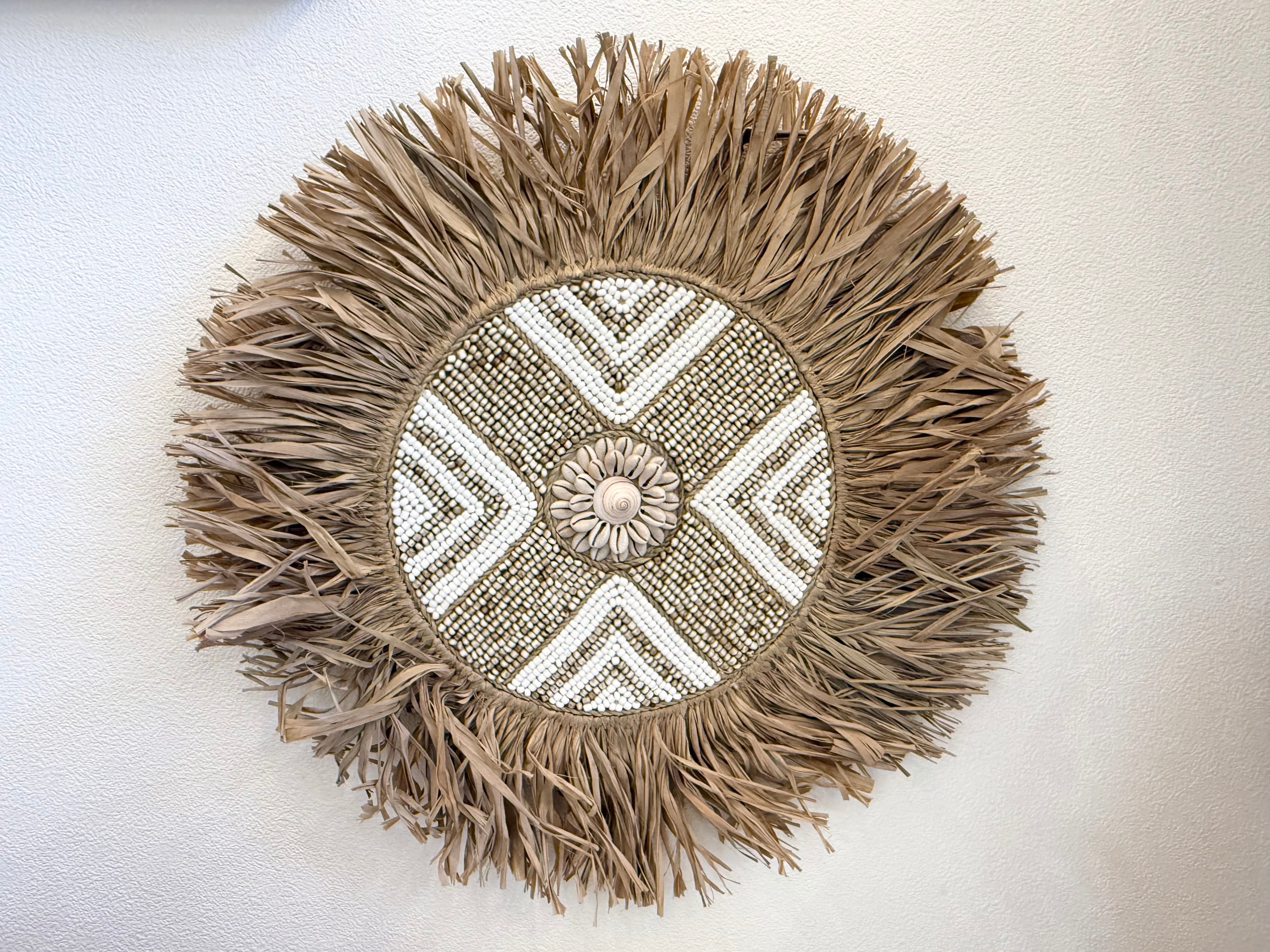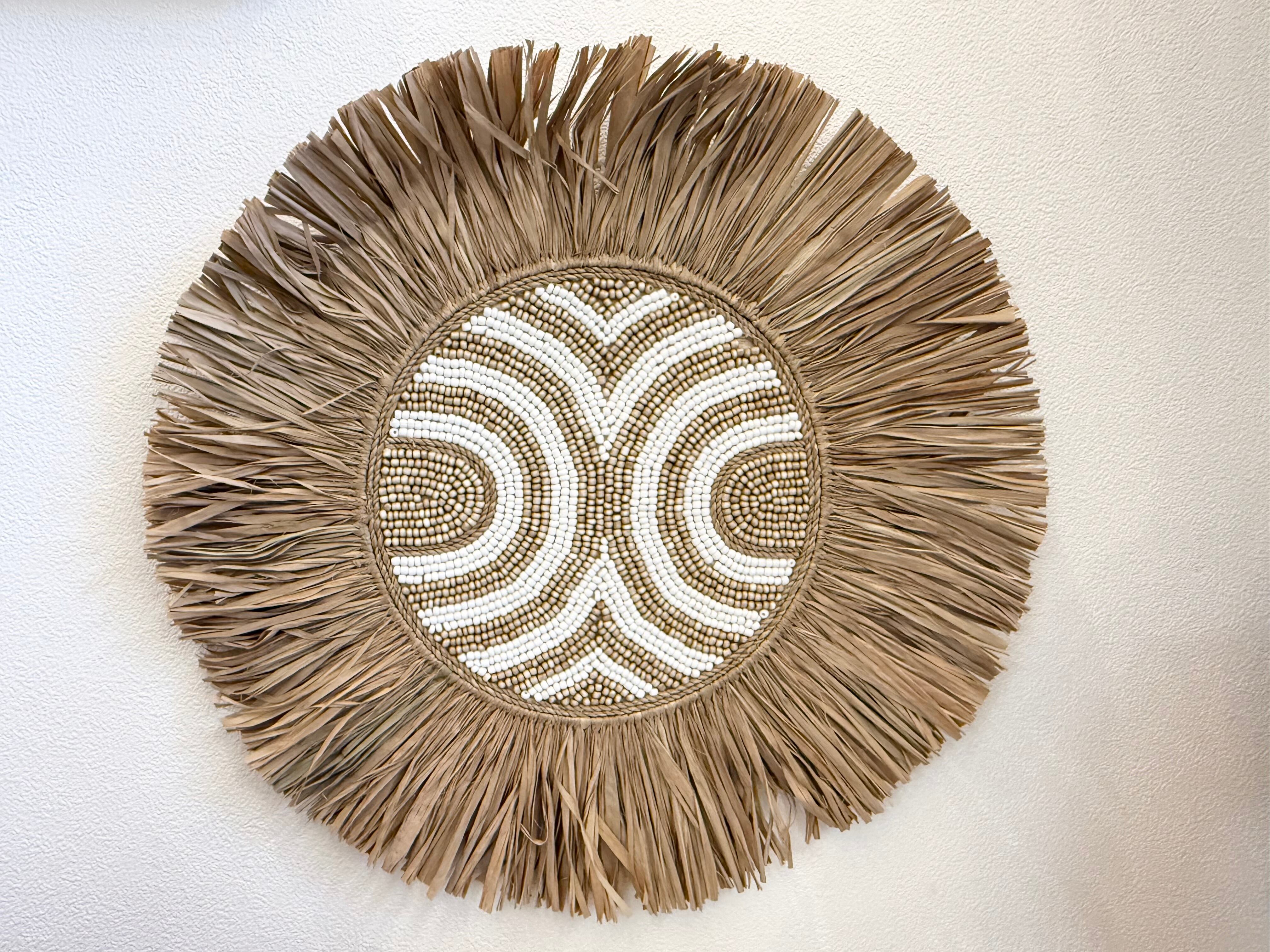 このウォールハンギングは、ラフィアとビーズを使用した素敵なデザインが魅力です。丸いフォルムが特徴的で、複数枚重ねて飾ることで、個性的なアートスペースを演出します!どんなお部屋にも調和し、温もりのある雰囲気を作り出します。