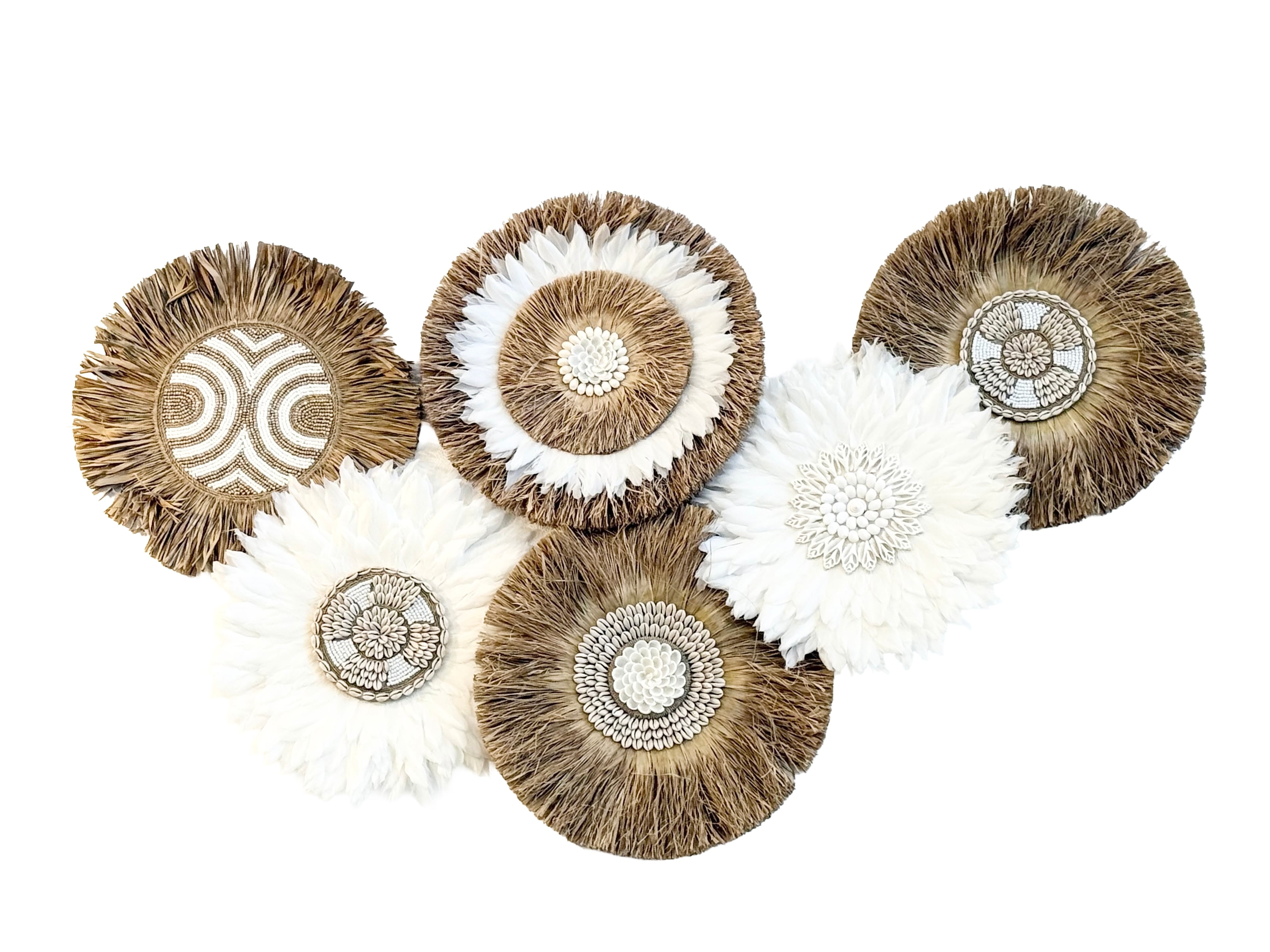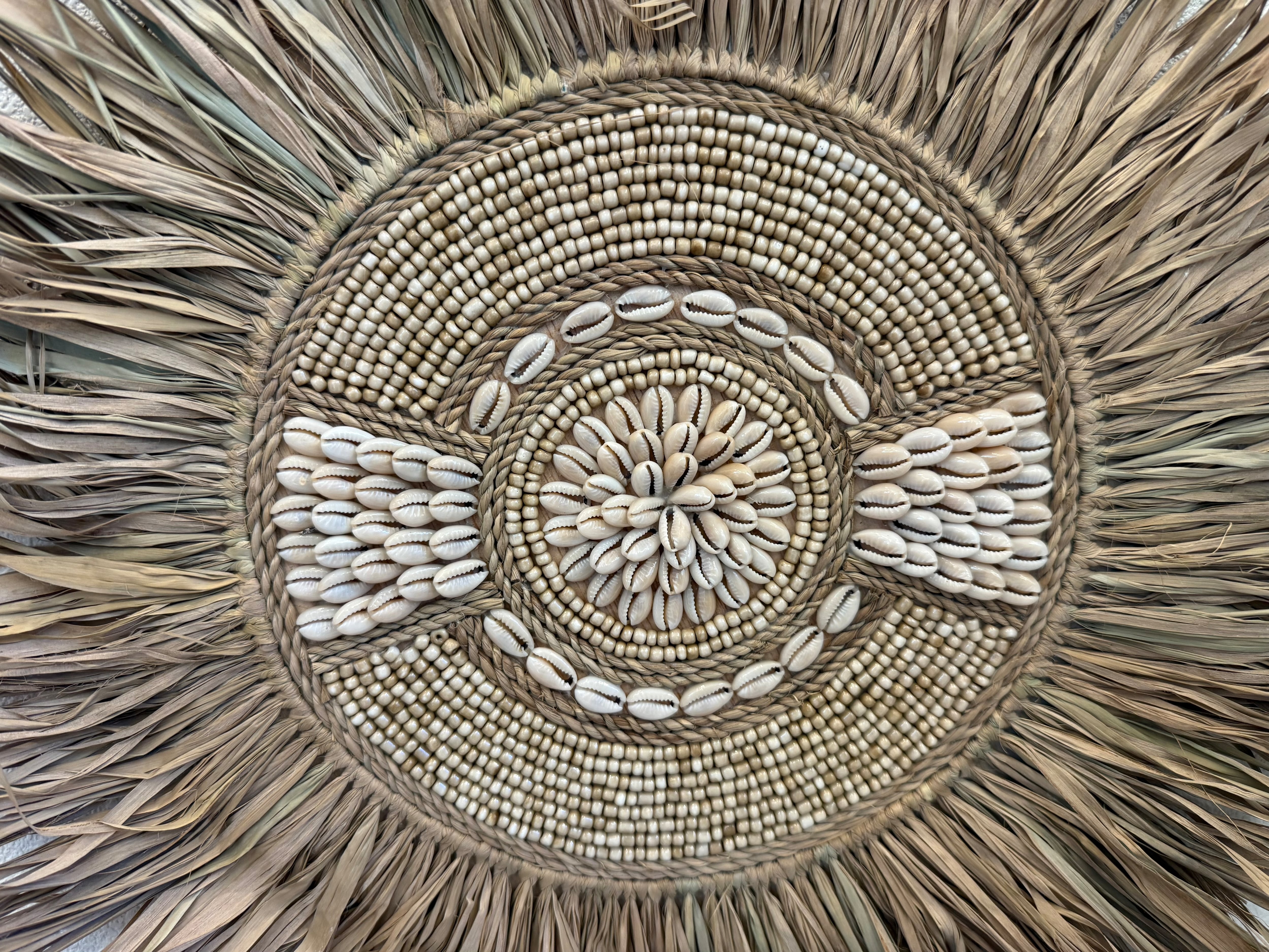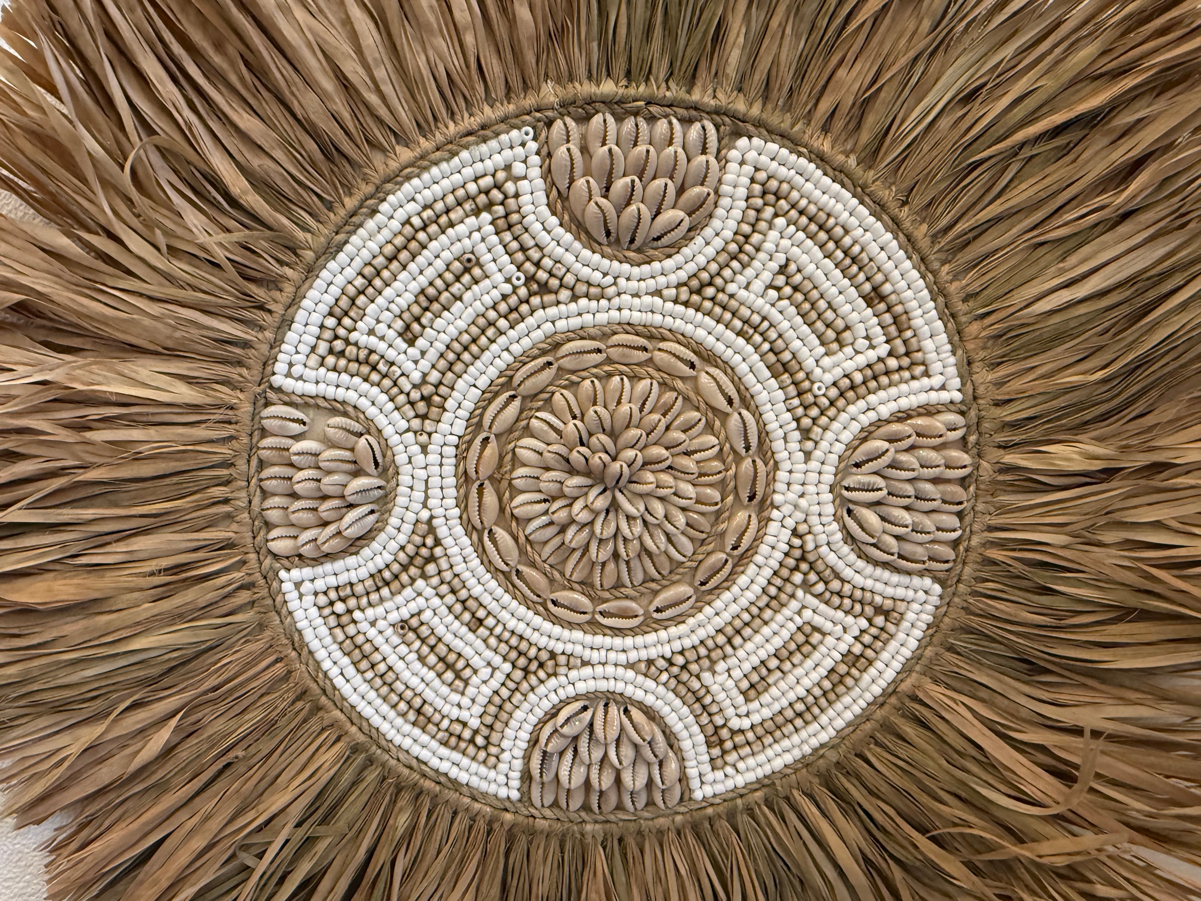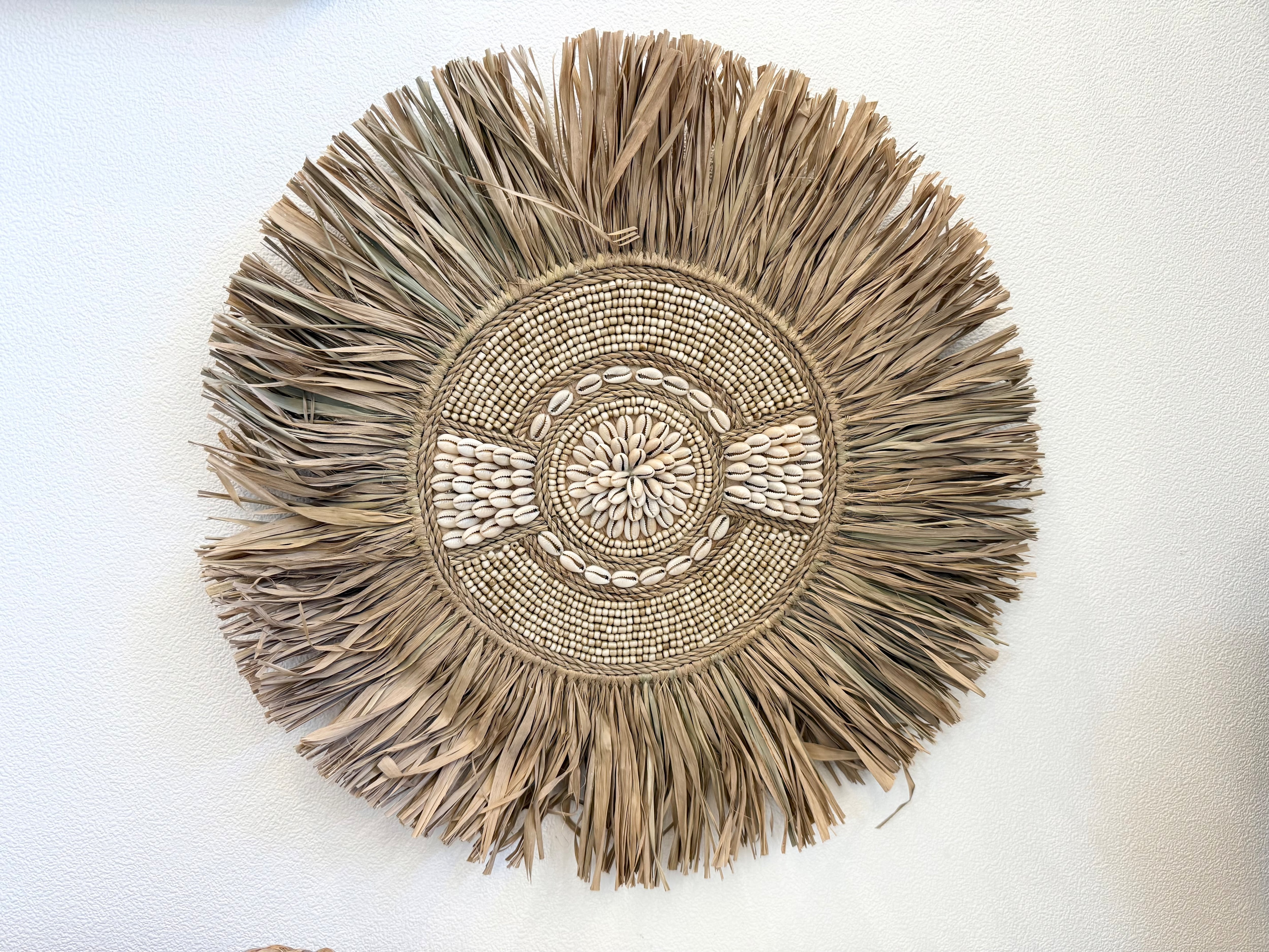このウォールハンギングは、ラフィアとビーズを使用した素敵なデザインが魅力です。丸いフォルムが特徴的で、複数枚重ねて飾ることで、個性的なアートスペースを演出します!どんなお部屋にも調和し、温もりのある雰囲気を作り出します。