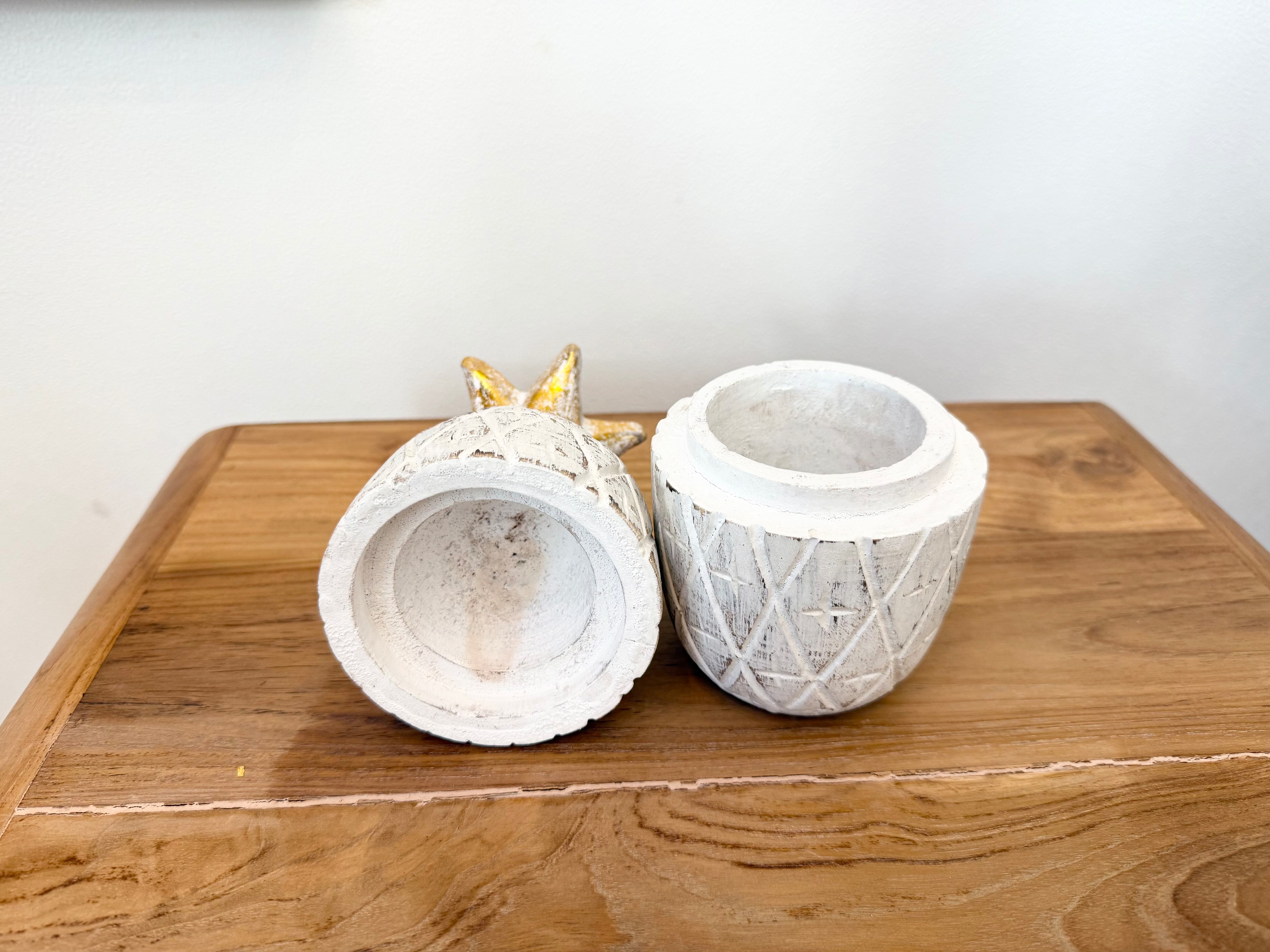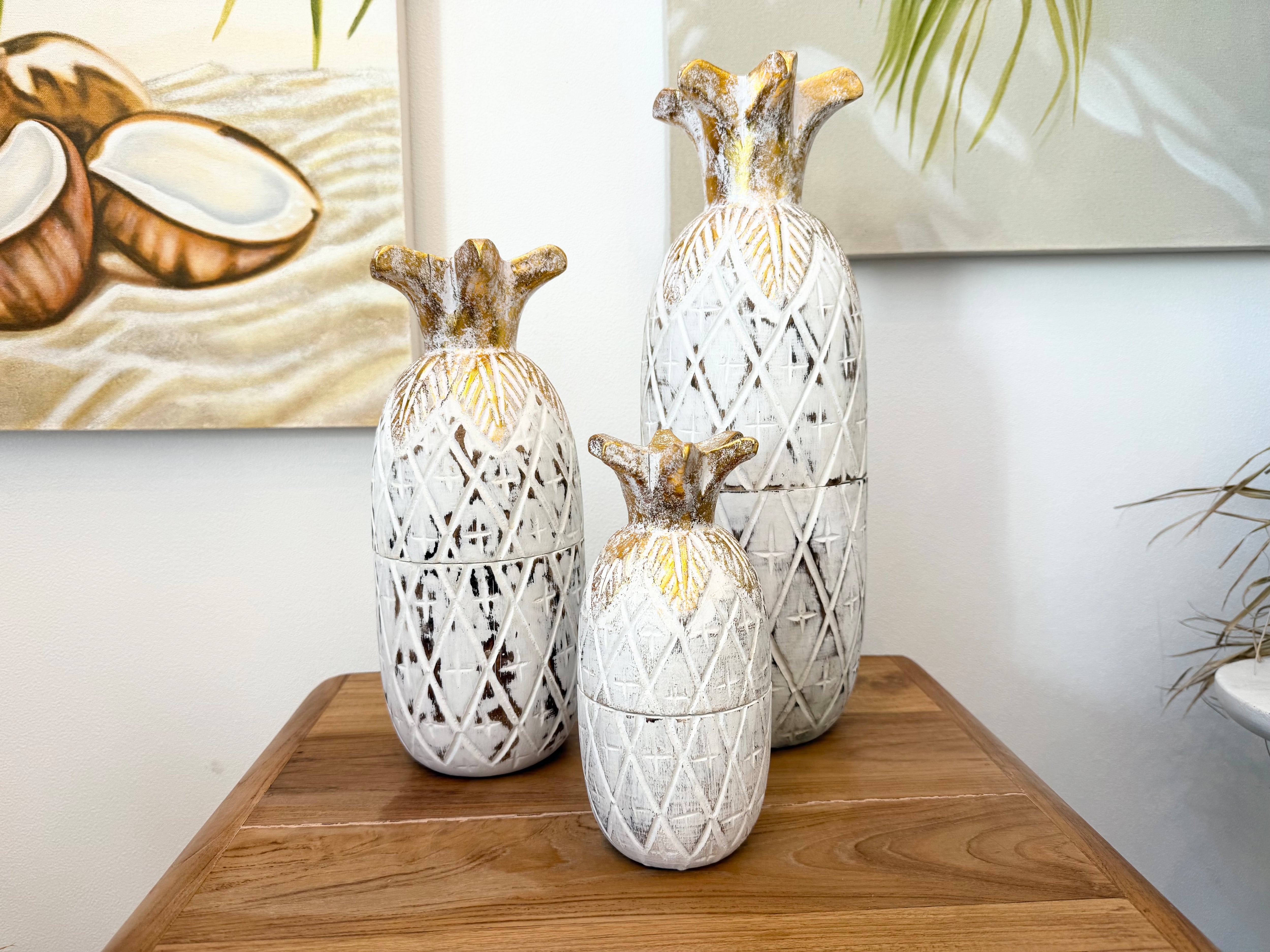 お洒落なインテリアを演出する「separate pineapple objet L size」が登場です!美しいパイナップルの形をしたこのオブジェは、なんと2つに分かれるデザイン。上部は蓋のようになっており、実用性とデザイン性を兼ね備えています。白とゴールドのコラボがとてもお洒落で、お部屋のアクセントにぴったりのアイテムです!このオブジェを飾ることで、特別な空間をさらに鮮やかに演出できることでしょう。