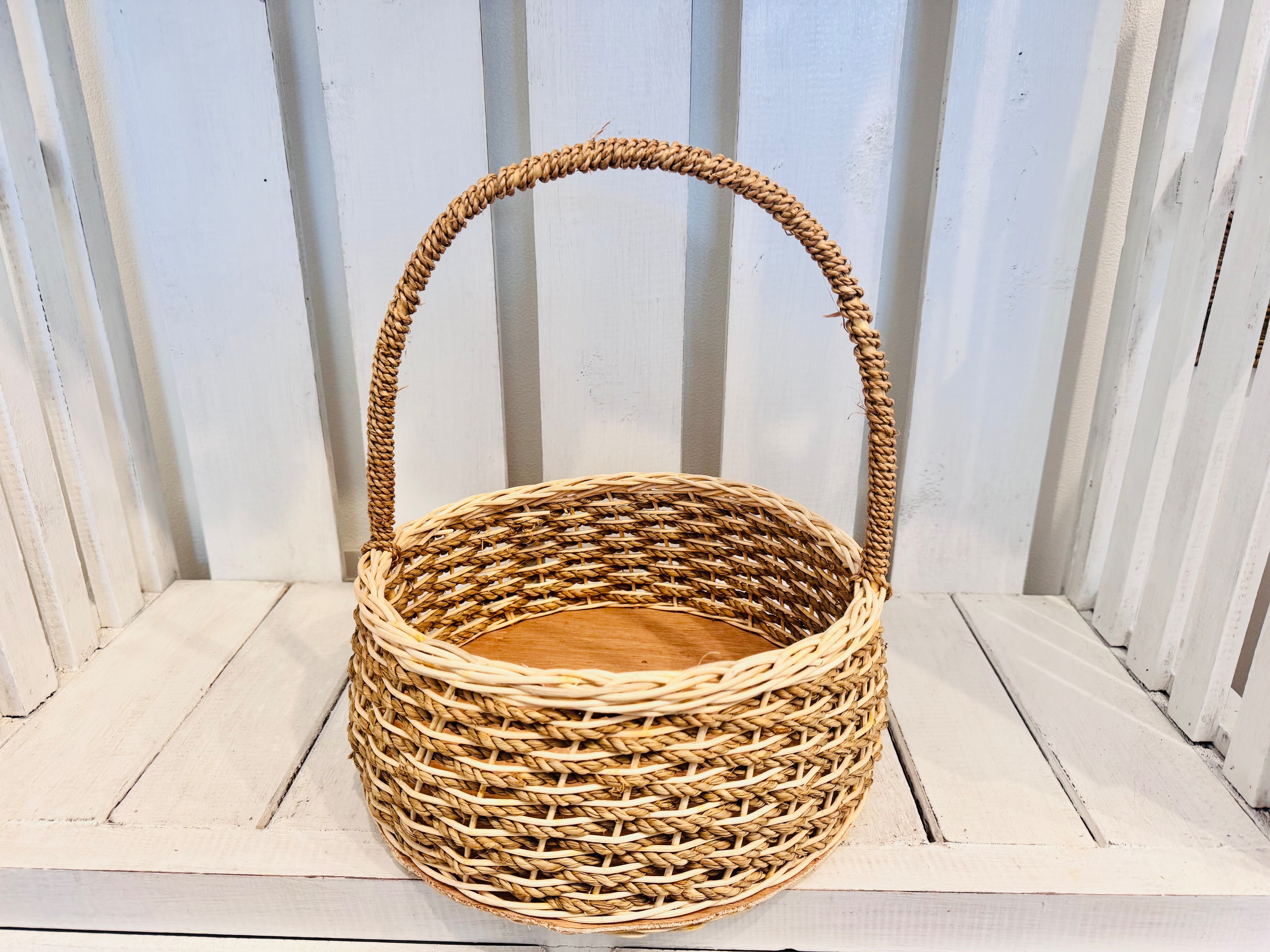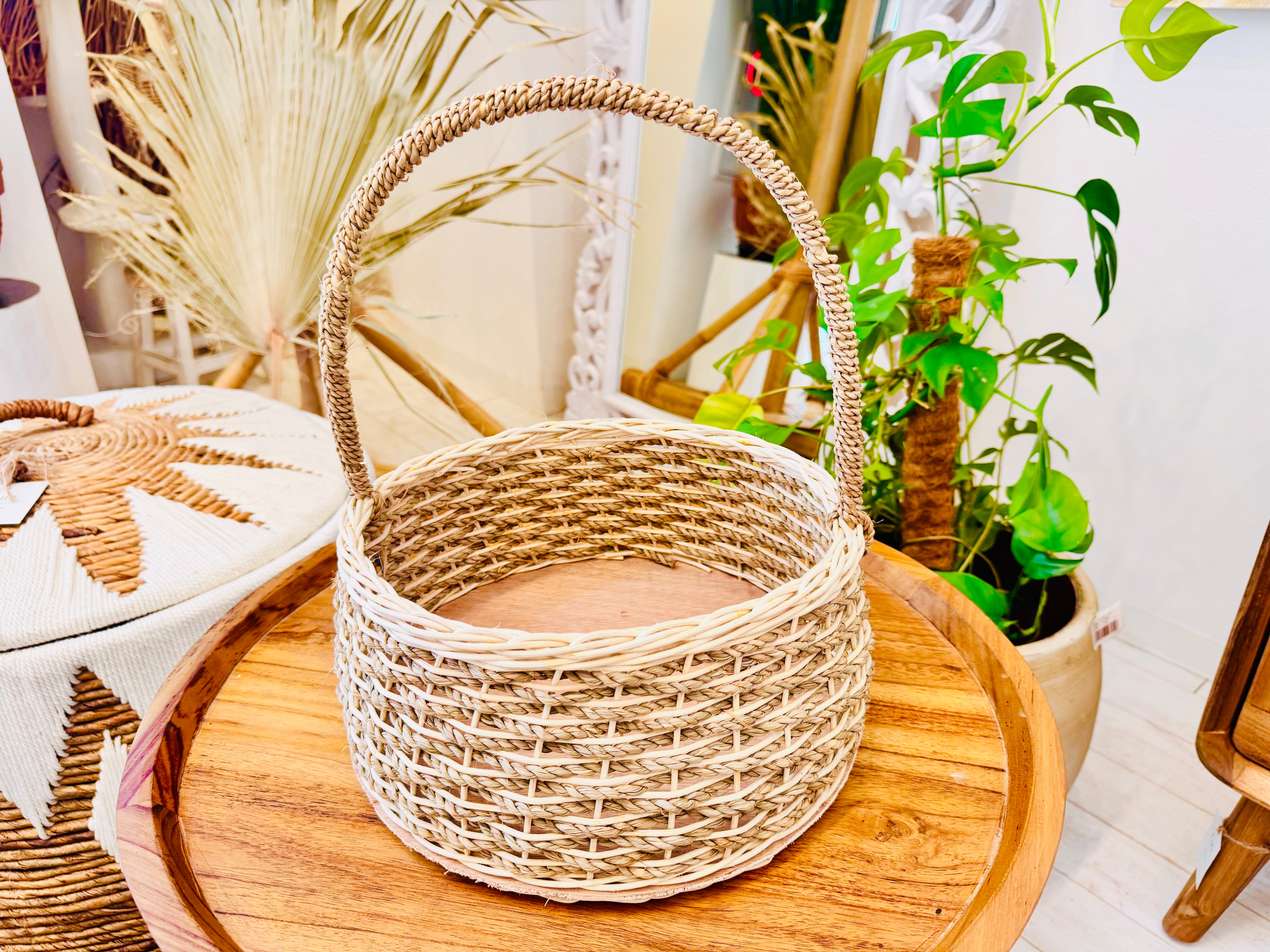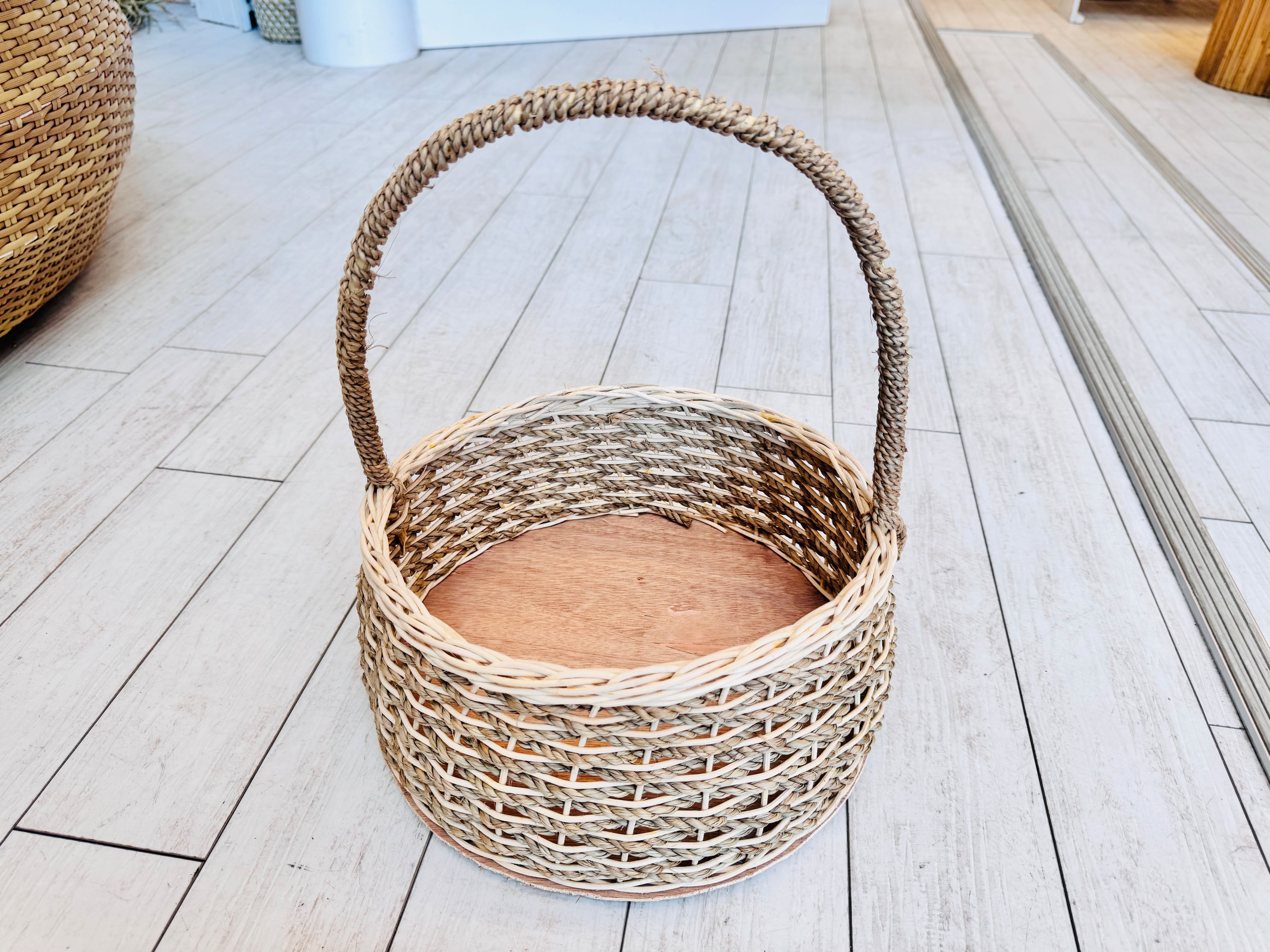 木製の底板を持ち、ラタンとシーグラスを組み合わせて編み込んだこのバスケットは、どんなインテリアにもマッチするデザインが魅力です。一つ一つ手作業で作られており、そのために生まれる味わい深い質感は、どこか温かみを感じさせてくれます。とても軽いので、持ち運びも簡単です!