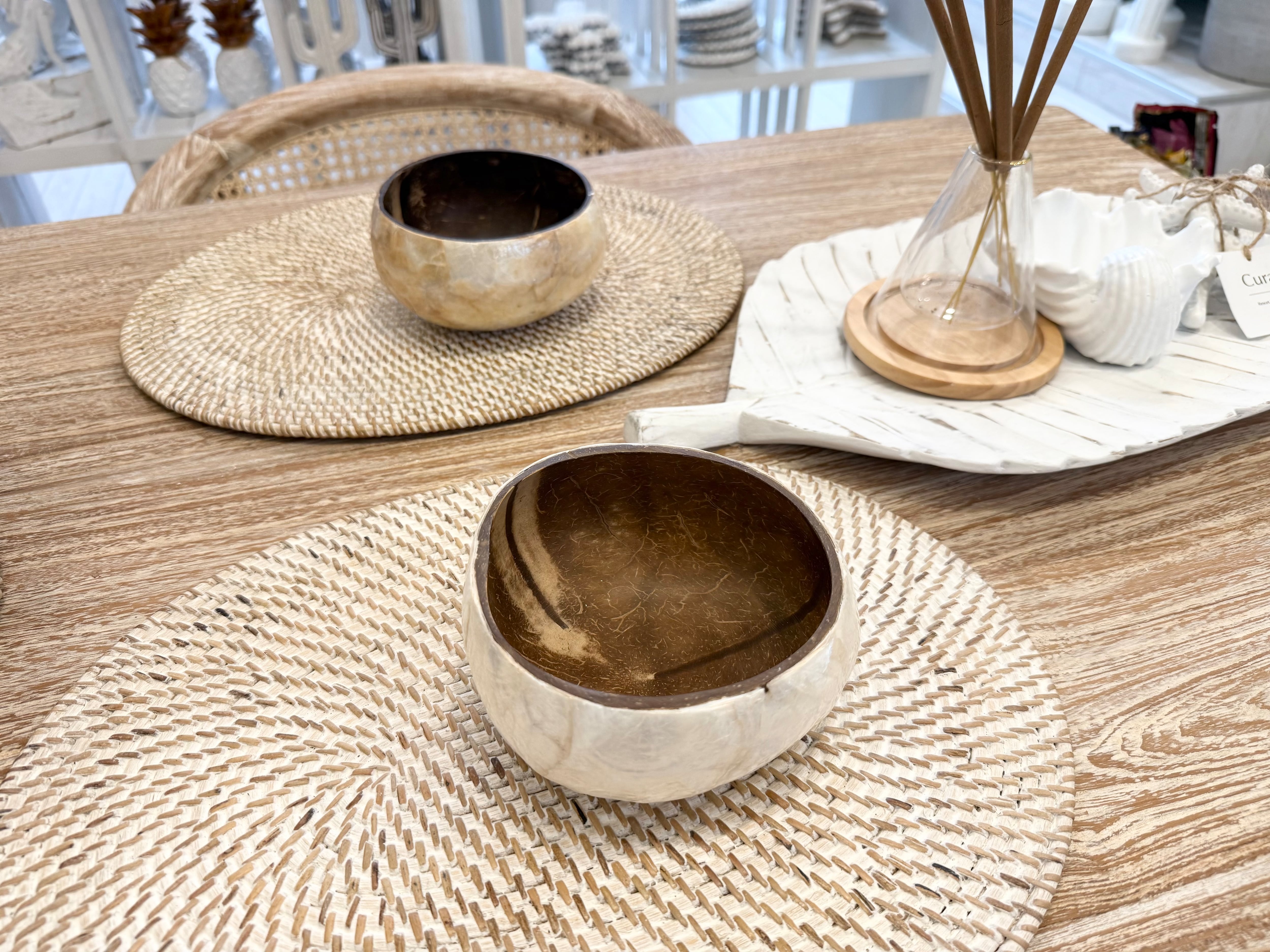 ココナッツの優しい質感は、どんなスタイルのインテリアにも馴染み、お部屋の雰囲気を一層引き立てます。また、天然のココナッツ素材を使用しているため、ひとつひとつがユニークな表情を持っています。リビングやキッチン、収納スペースなど、多彩なシーンで大活躍!心地よいライフスタイルをサポートするアイテムです!自然素材の温かみを感じたい方にはぜひおすすめです!