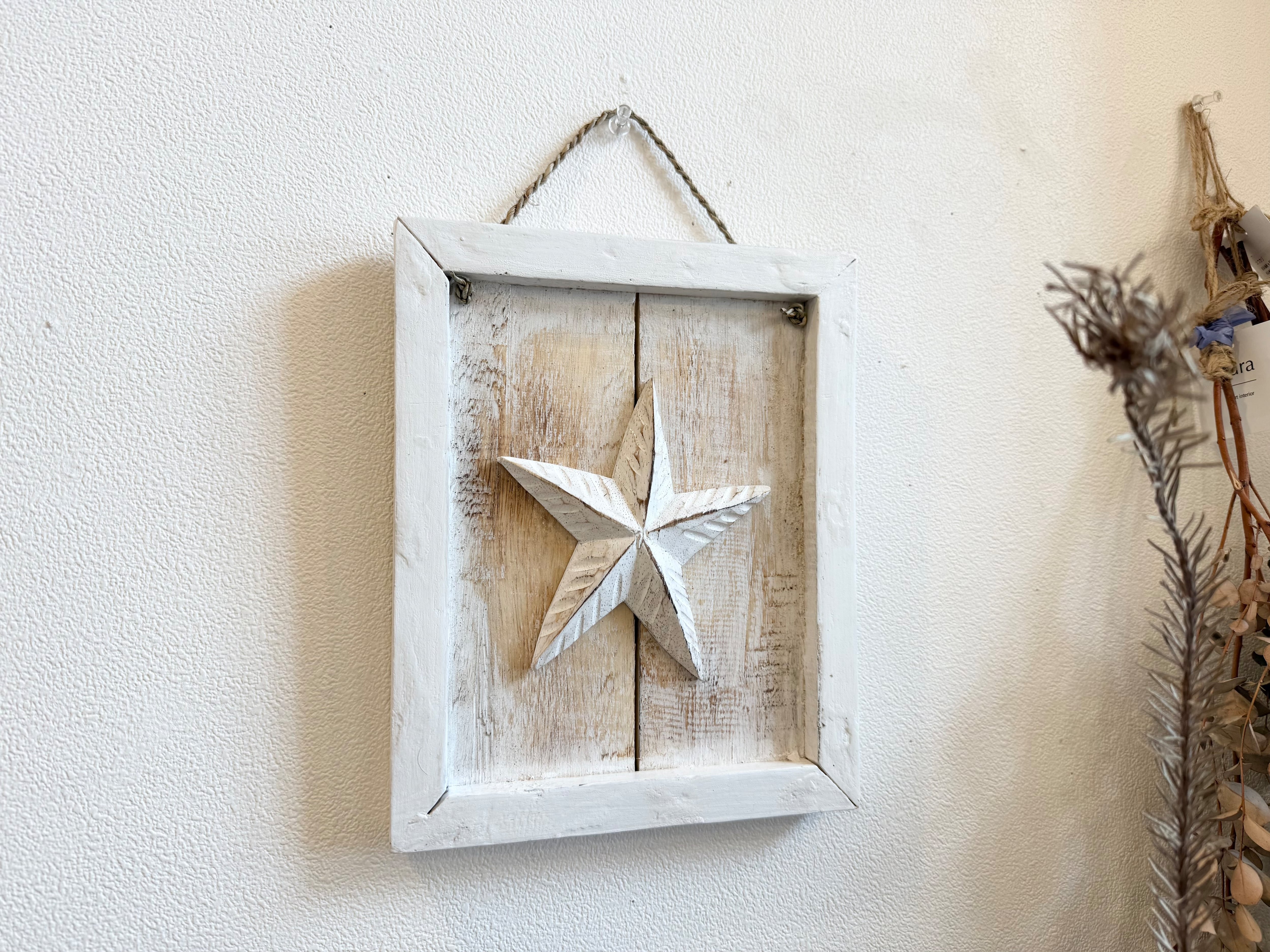 この商品は、手作りの木製ハンギングオブジェ「wood star design hanging」です。真ん中に星のオブジェがついたデザインが特徴で、シンプルながらもお部屋を華やかに演出するアイテムです!リビングや寝室、子供部屋など、さまざまな空間にぴったり合います。