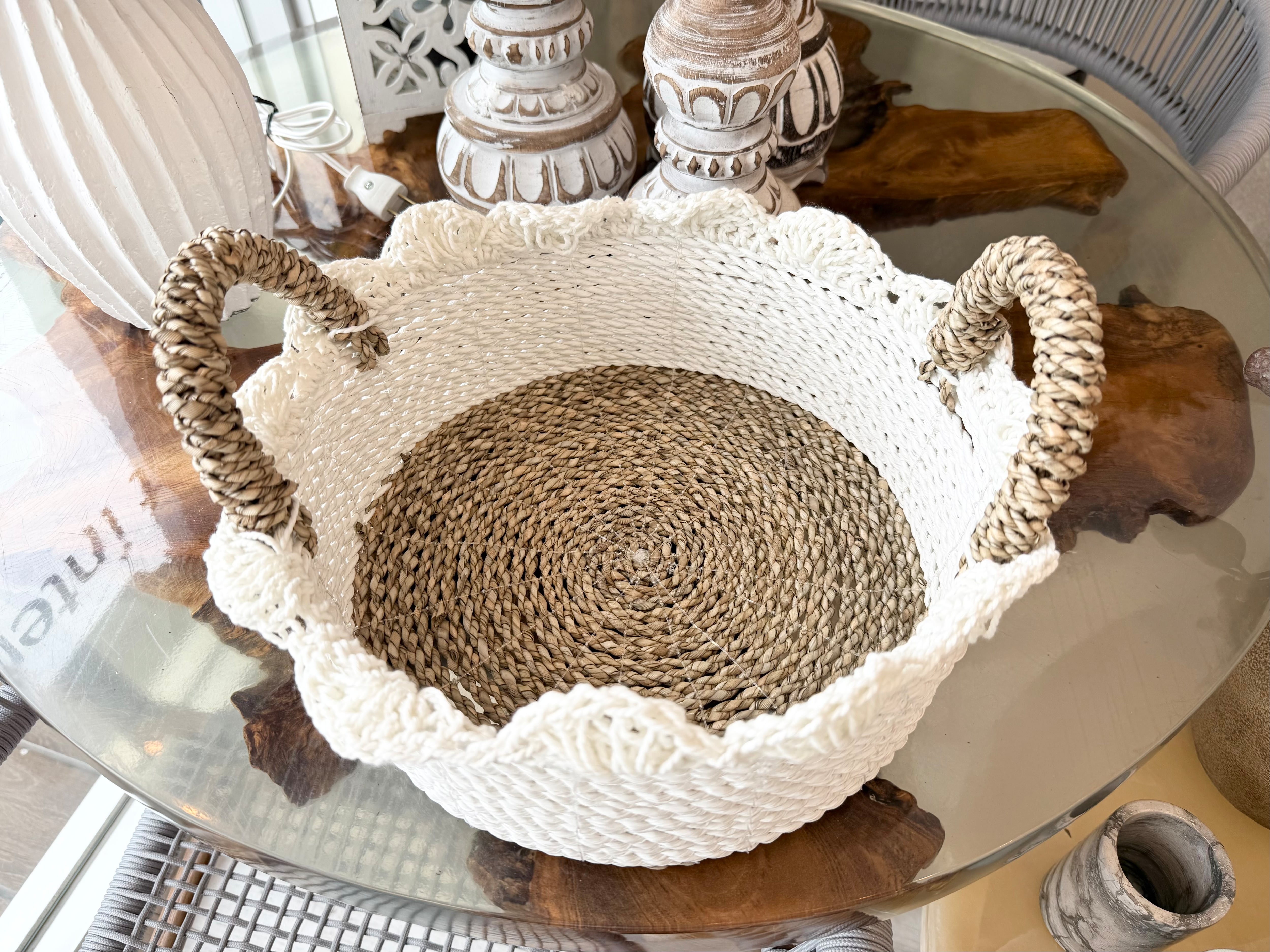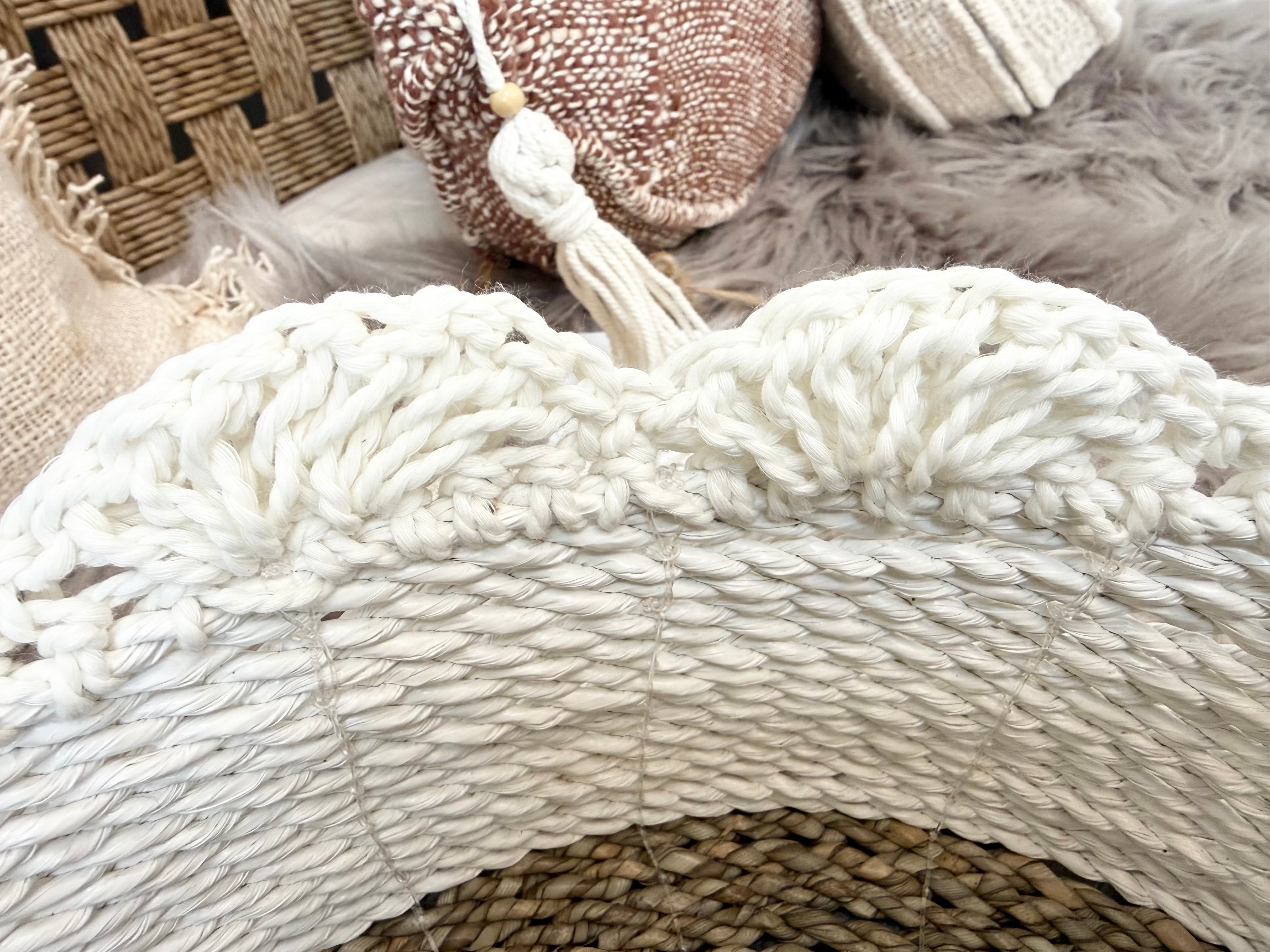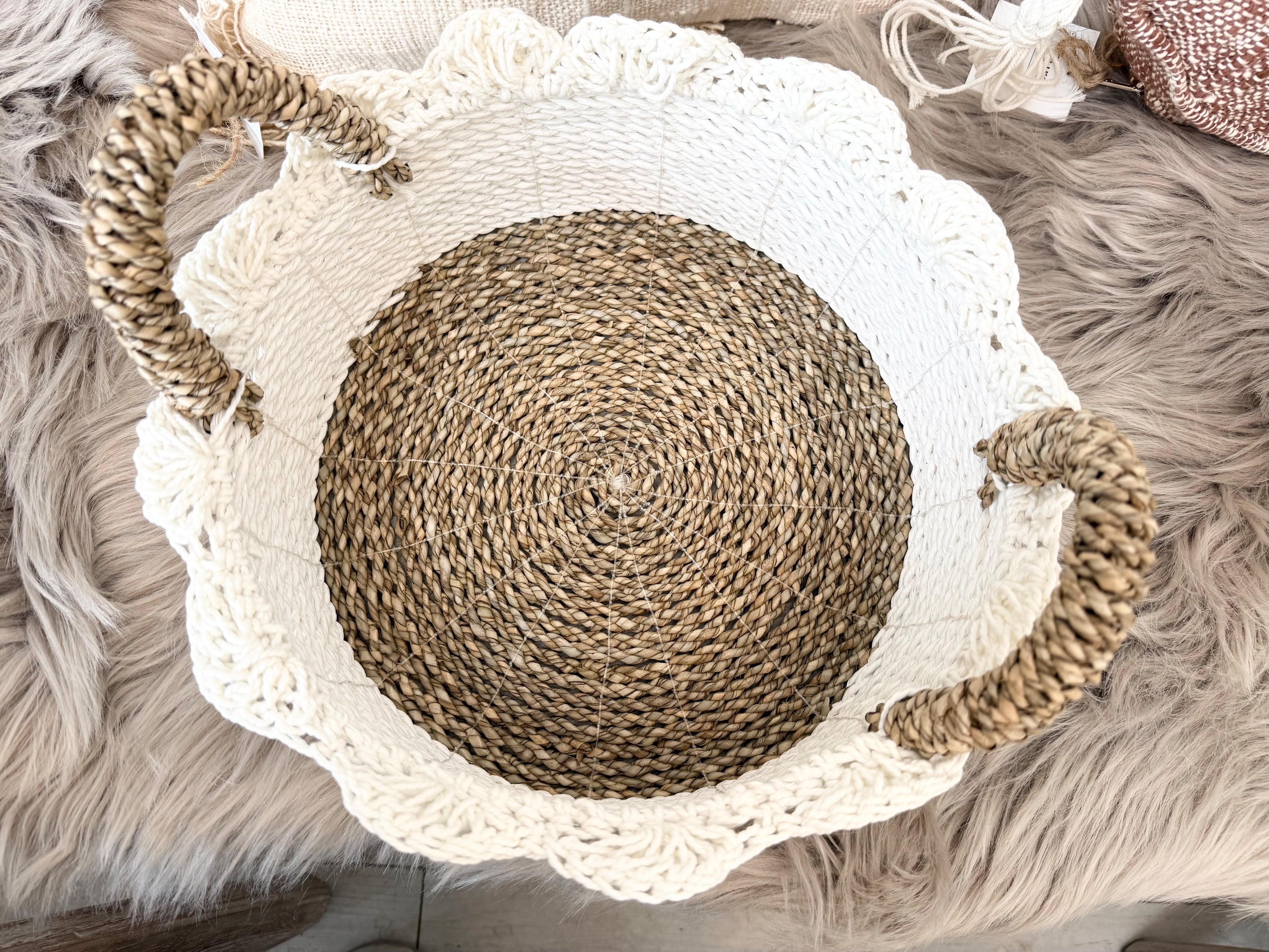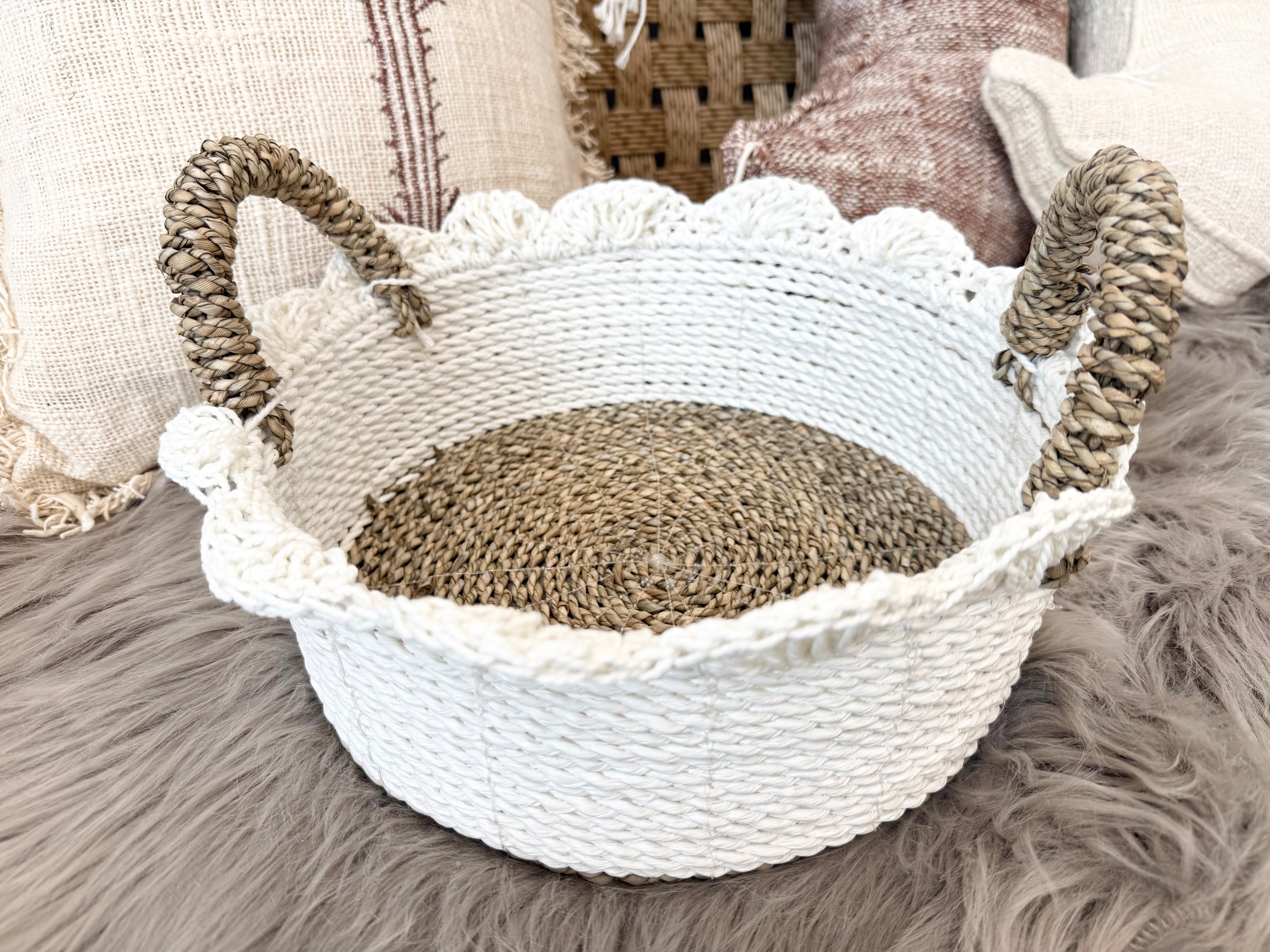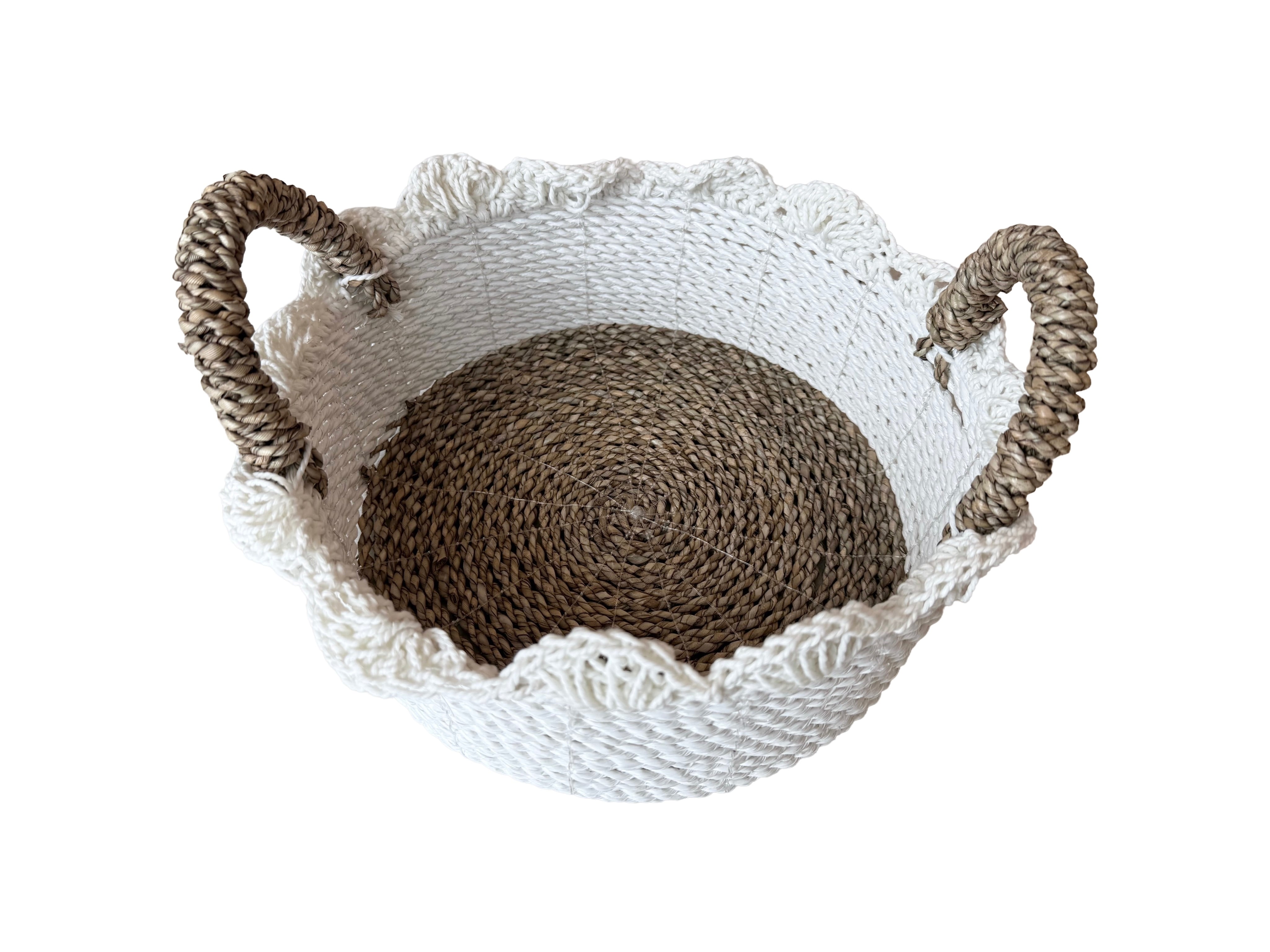 この商品は、かわいらしい「Handled basket」です。持ち手のついたこのバスケットは、ふちに施されたひらひらがまるで花のように可愛らしく、インテリアに彩りを添えるアイテムです!リビングやキッチン、さらには子供部屋など、さまざまな場所で活躍します。