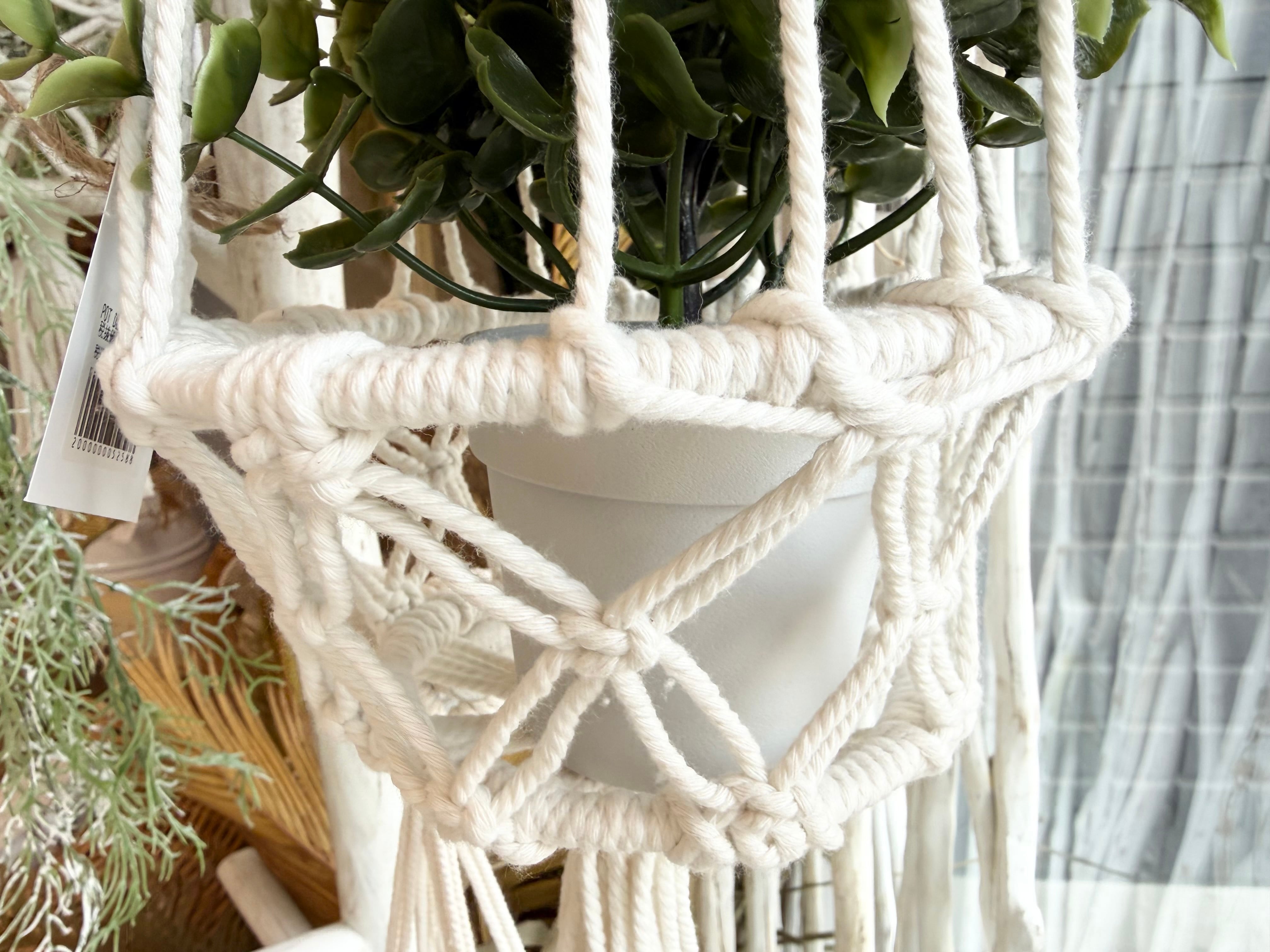 ナチュラルな雰囲気を醸し出す、マクラメ編みのハンギングフラワーポットです。観葉植物を引き立てるデザインは、お部屋やバルコニーに癒しの空間を演出します。