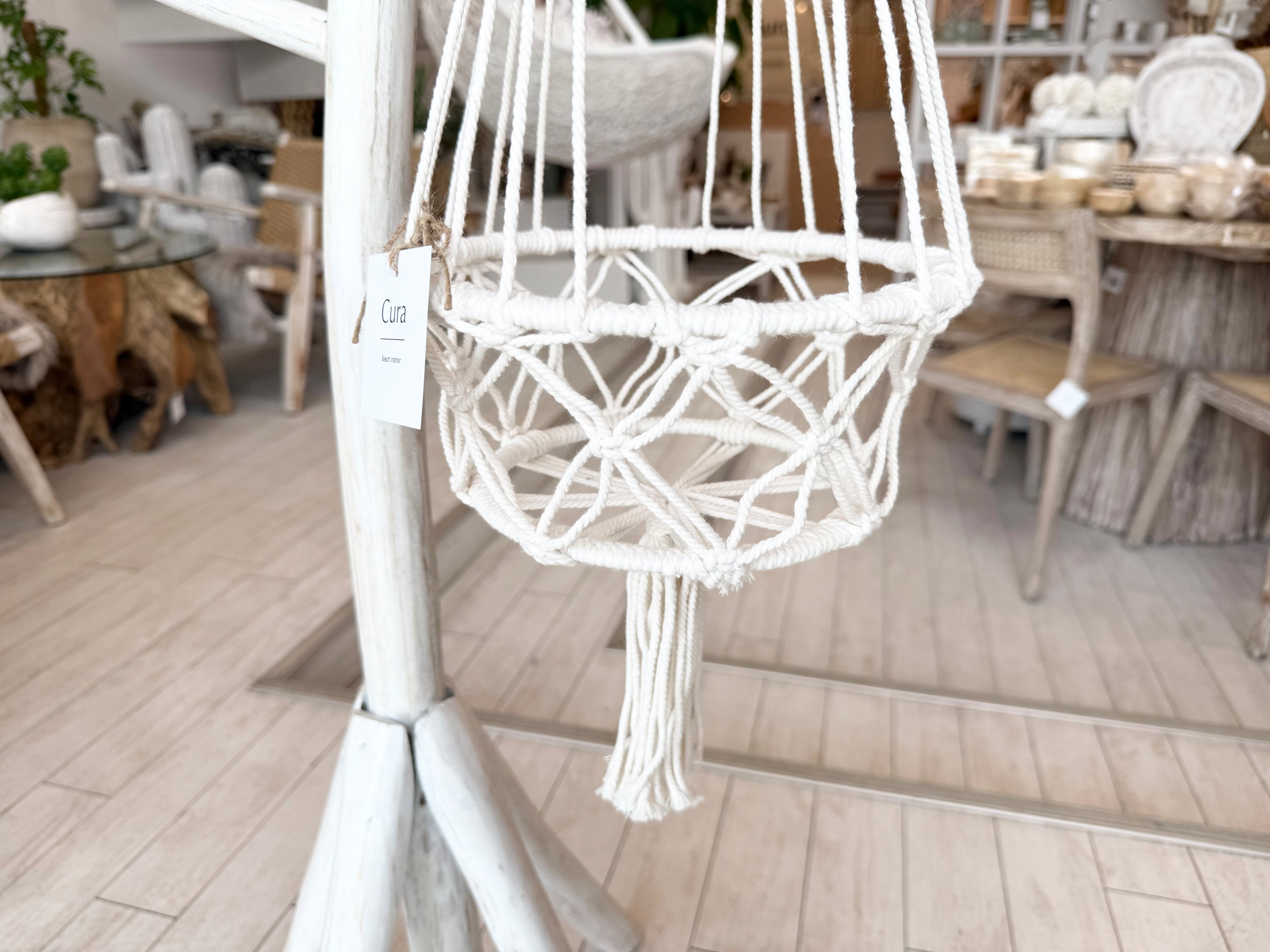 ナチュラルな雰囲気を醸し出す、マクラメ編みのハンギングフラワーポットです。観葉植物を引き立てるデザインは、お部屋やバルコニーに癒しの空間を演出します。