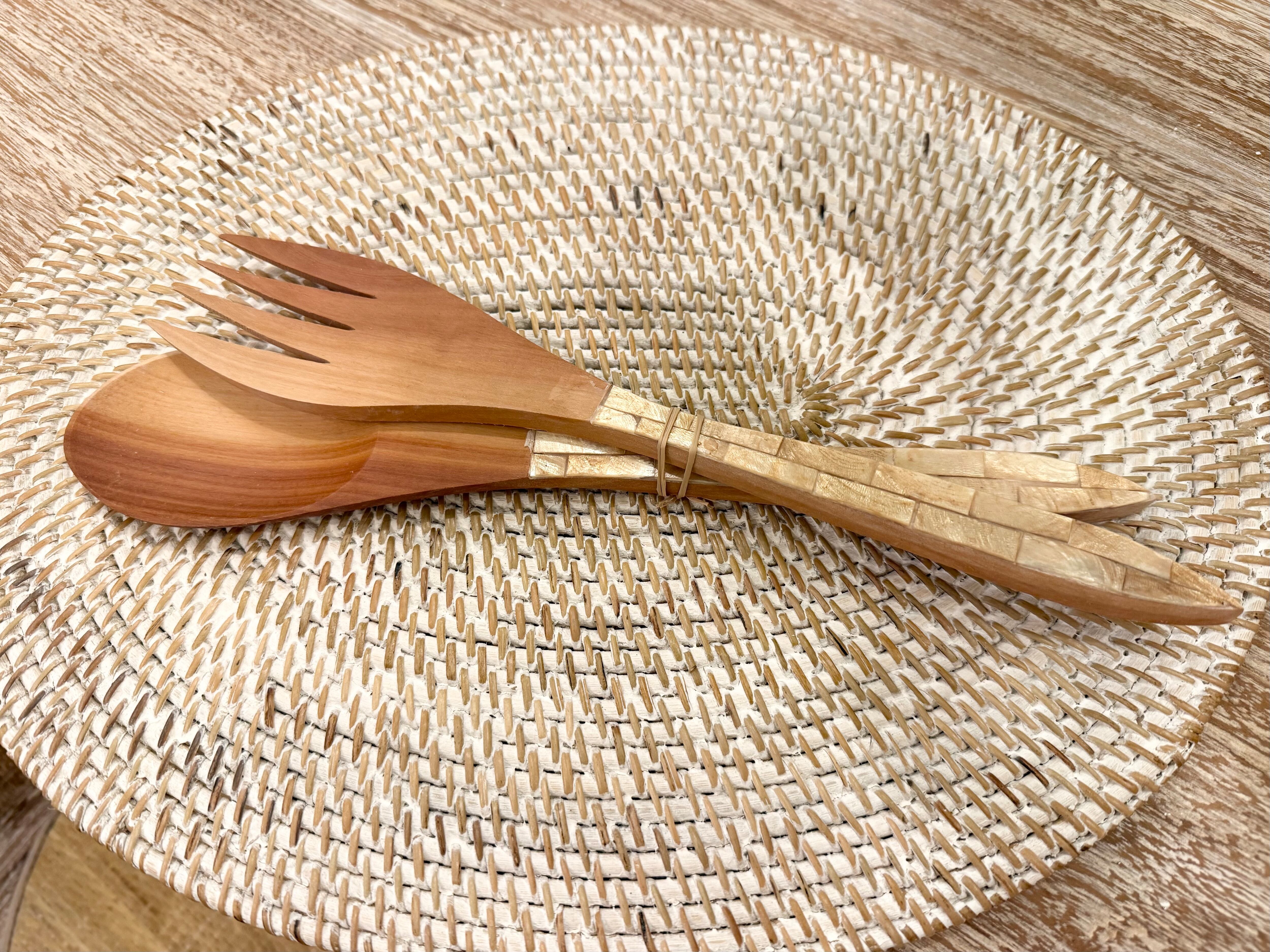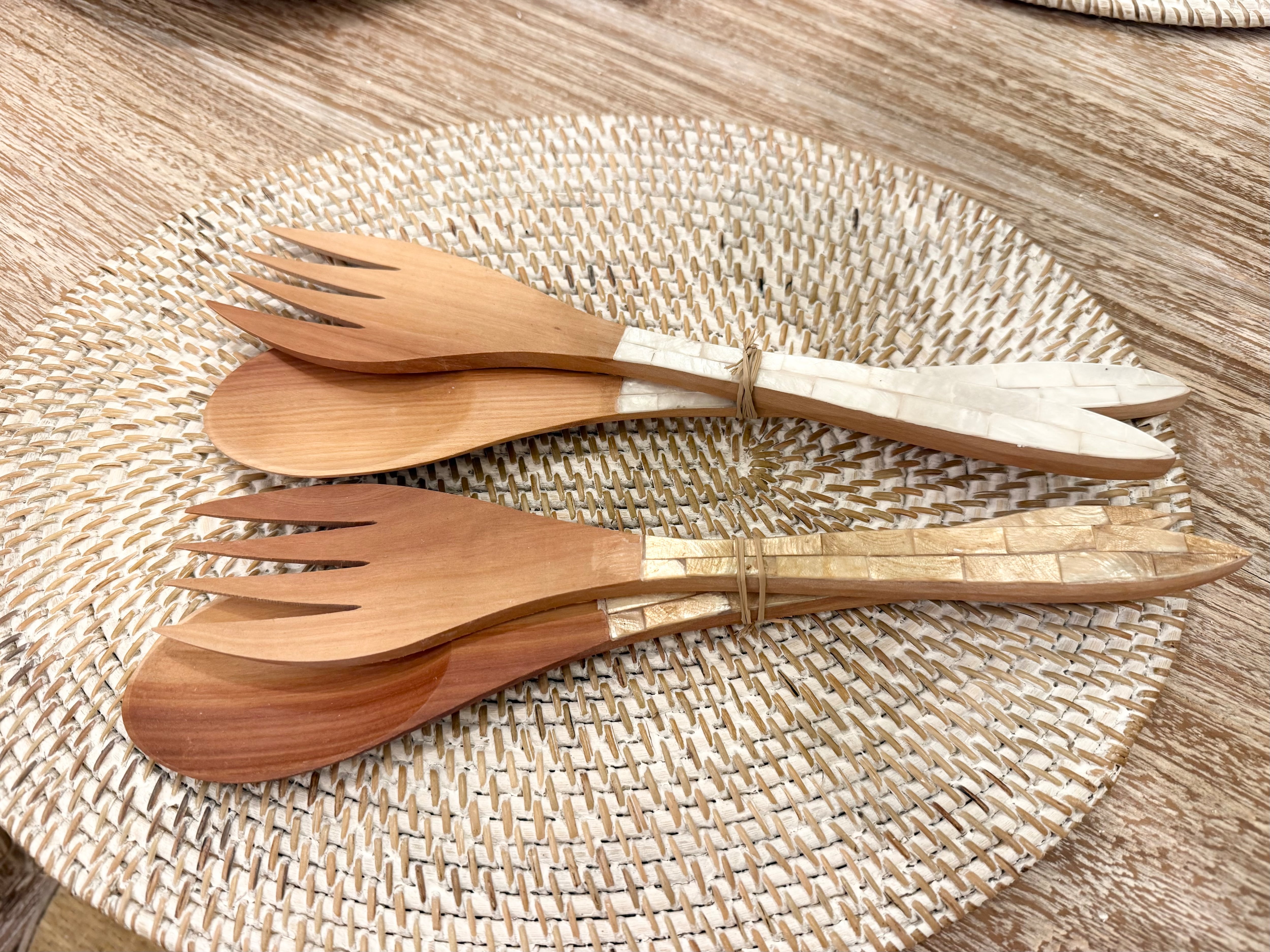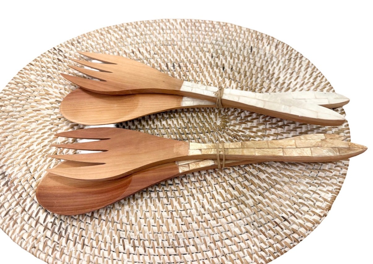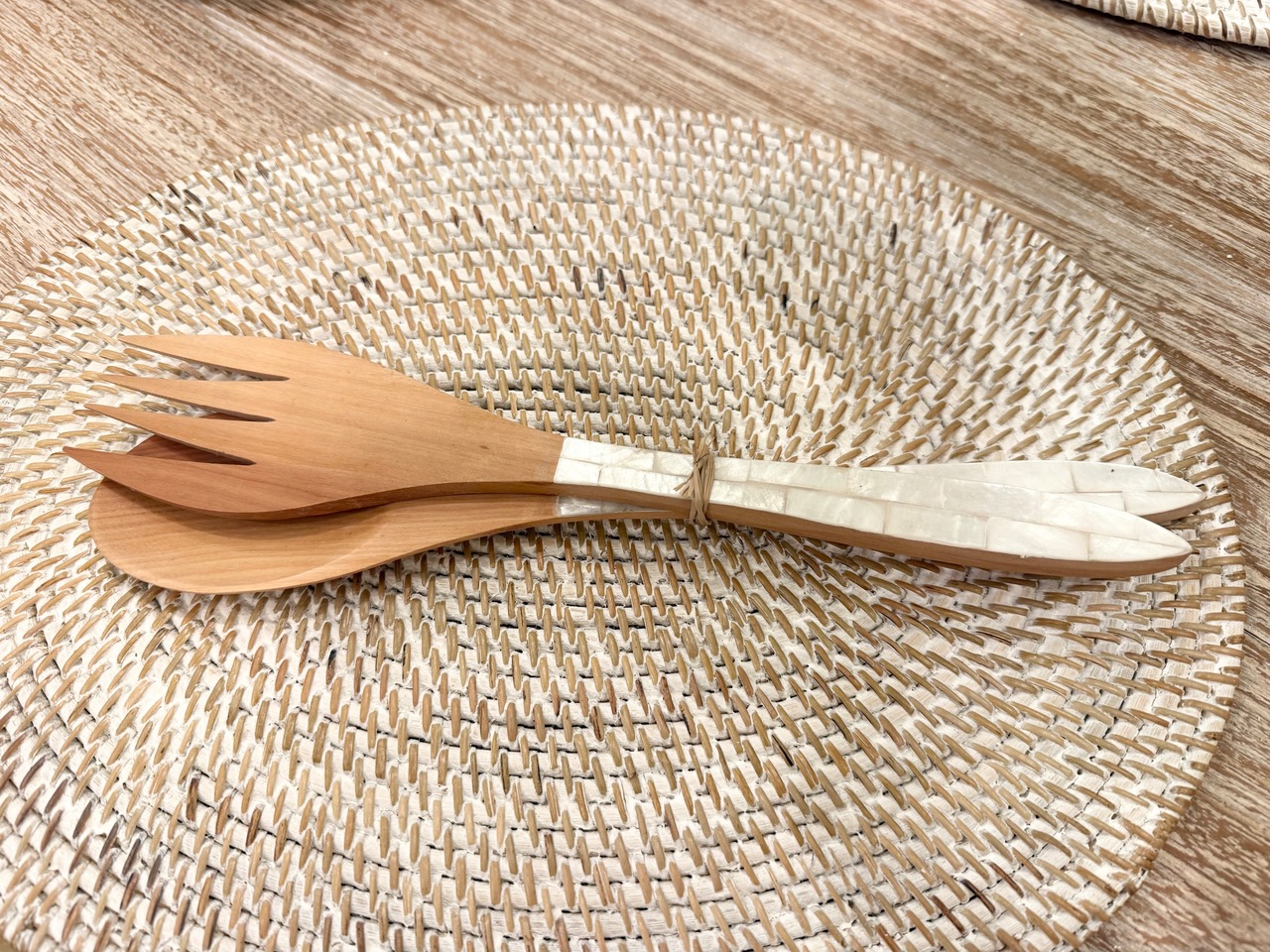 サラダなどを美しく取り分けるためのスプーンとフォークのセットです。持ち手にはシェルがあしらわれており、食卓にエレガントなアクセントを加えます。