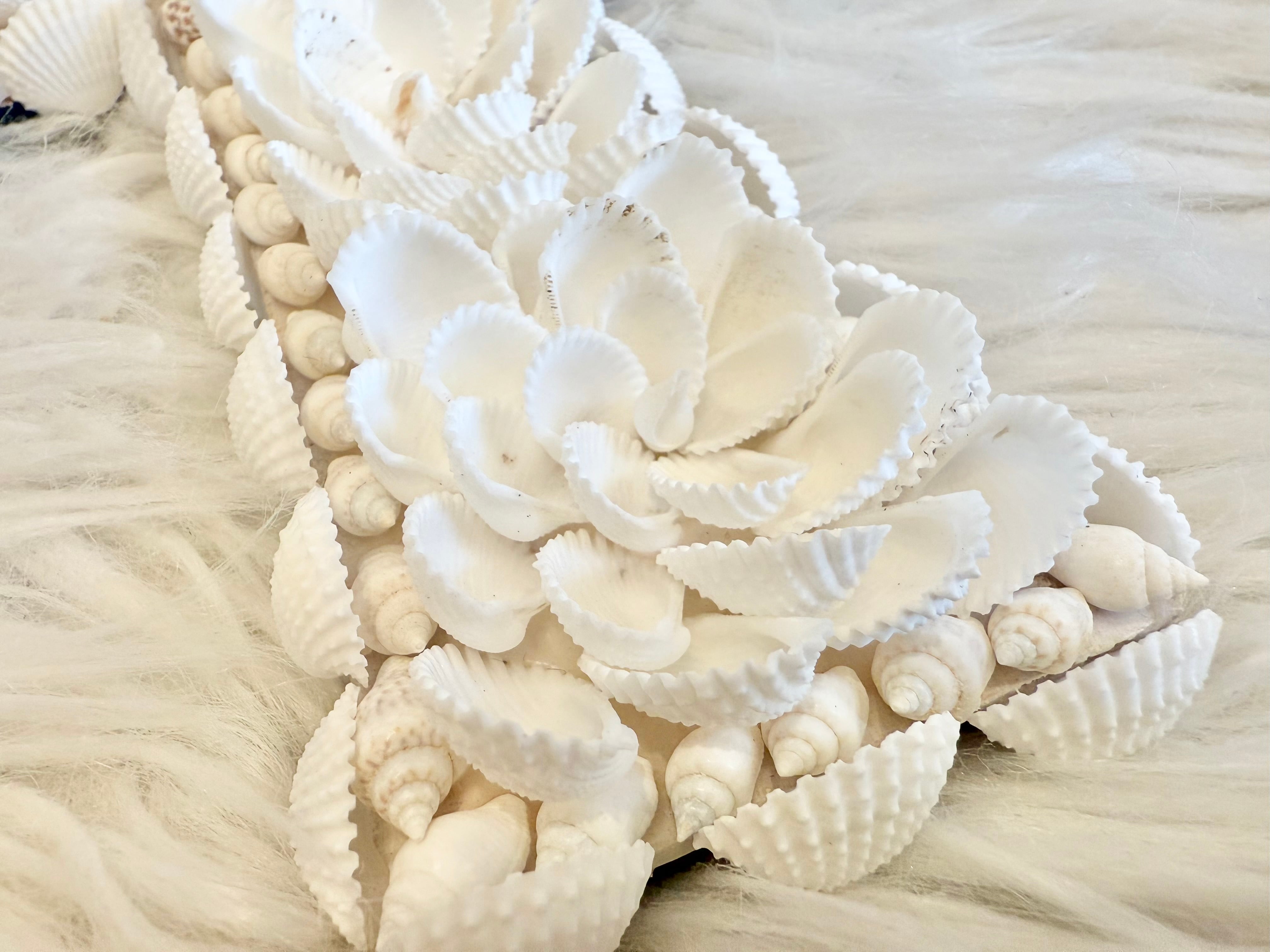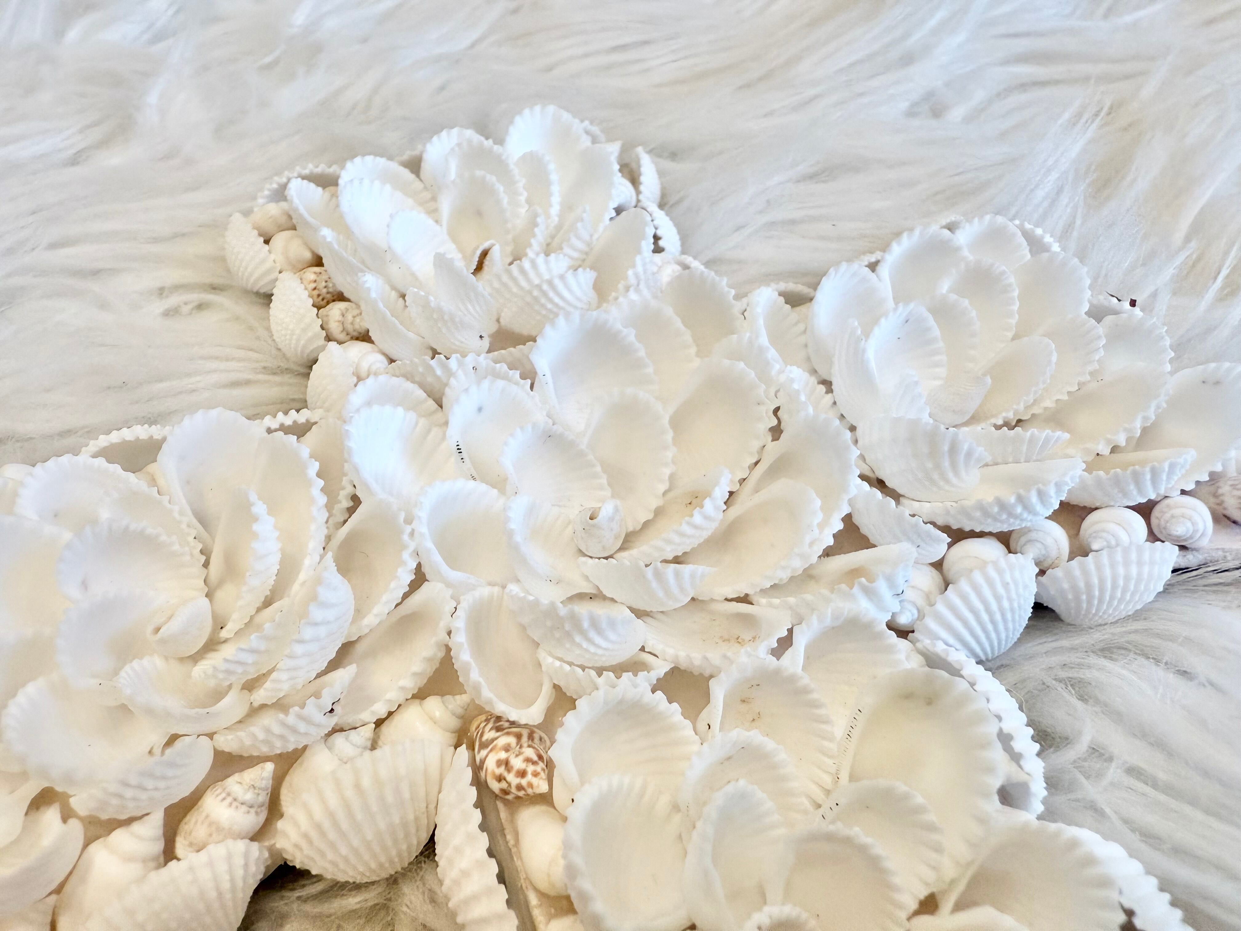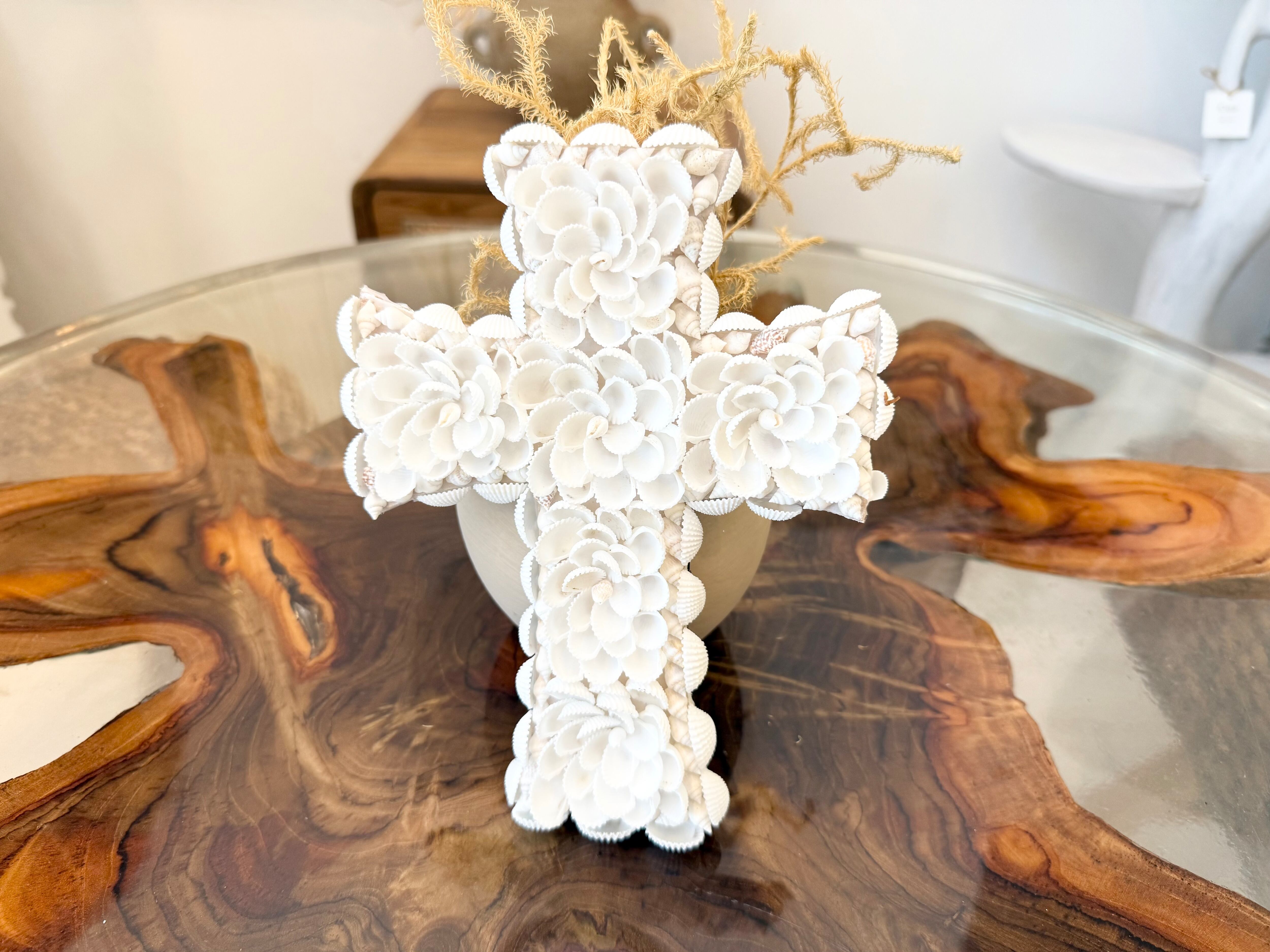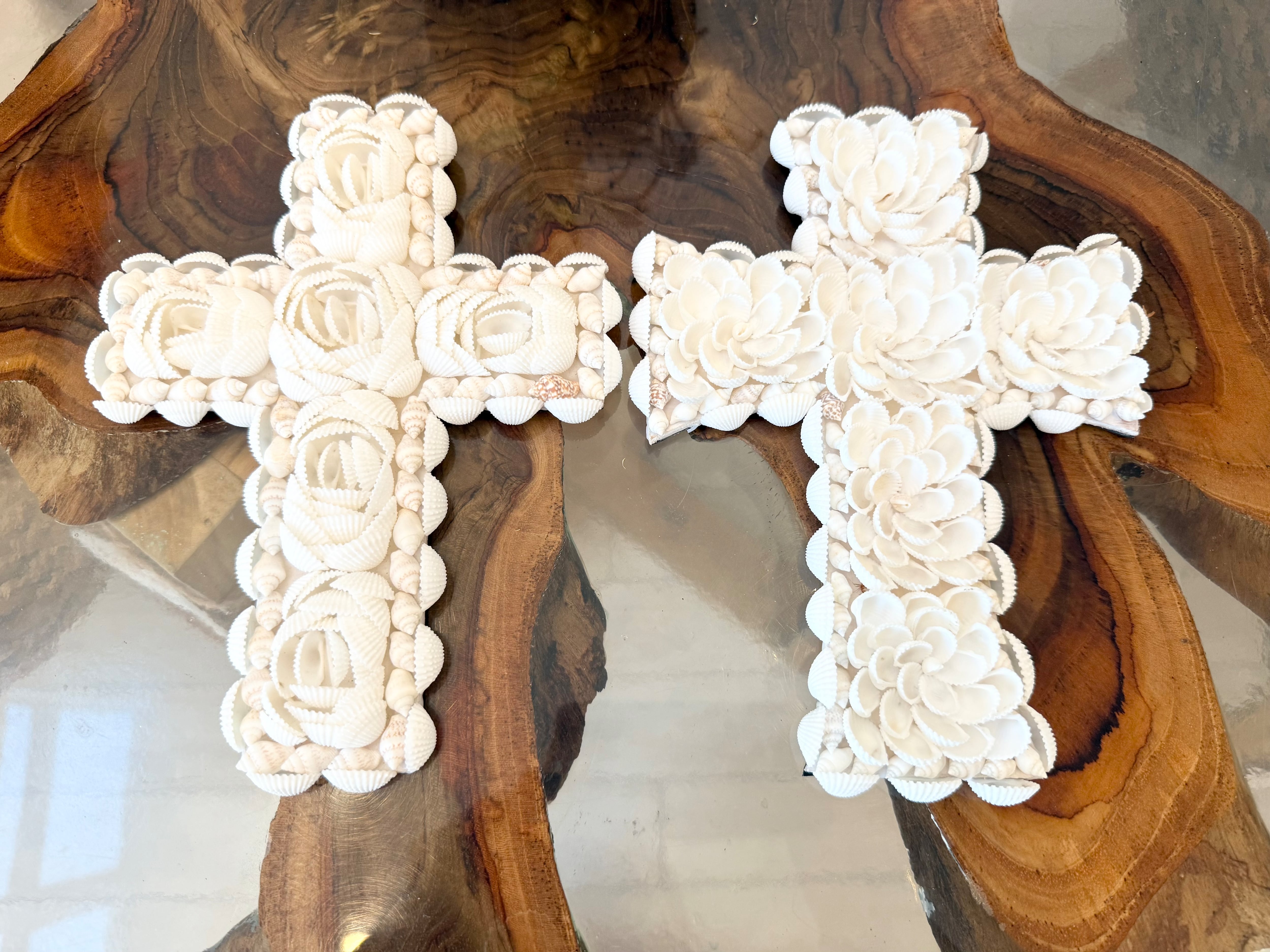 小さなシェルを集め、フラワー型に並べクロスを作りました。