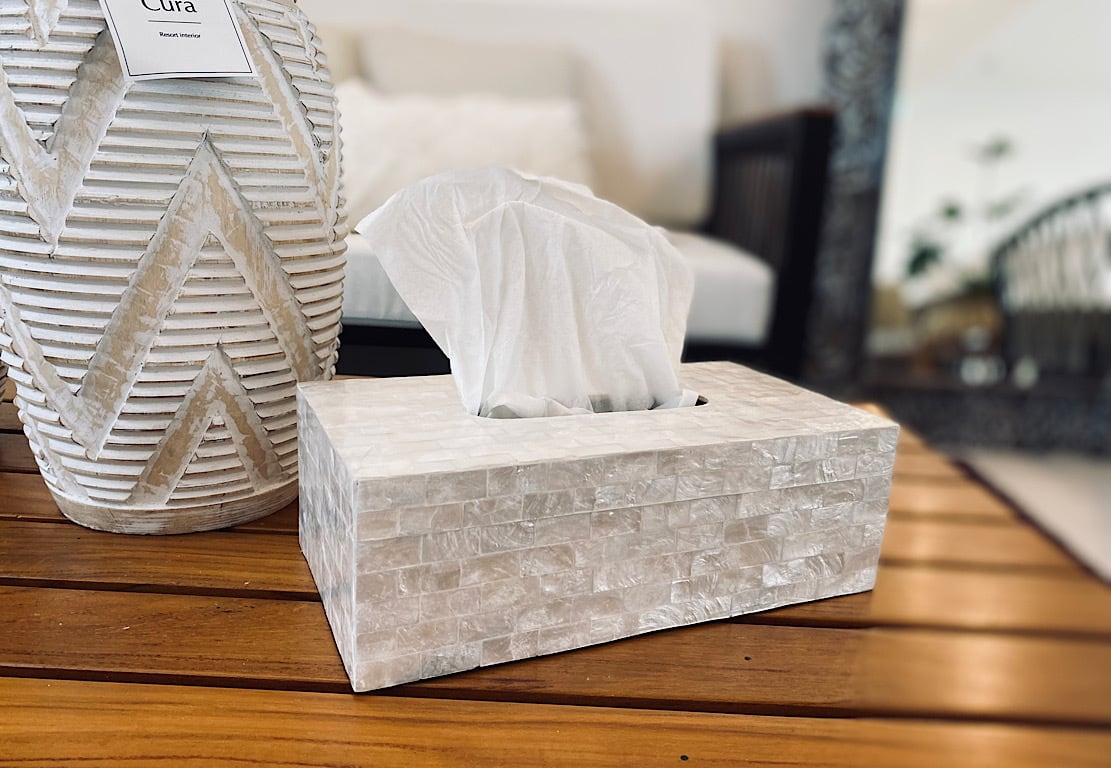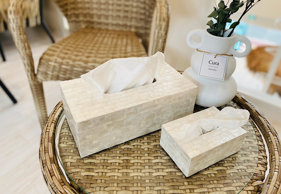 天然のシェルを使って作られたティッシュBOXです。Lサイズは大きい箱のティッシュも入れることができます。シェルが光に反射してとても綺麗です。