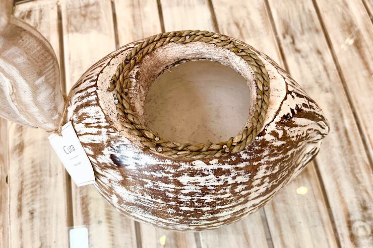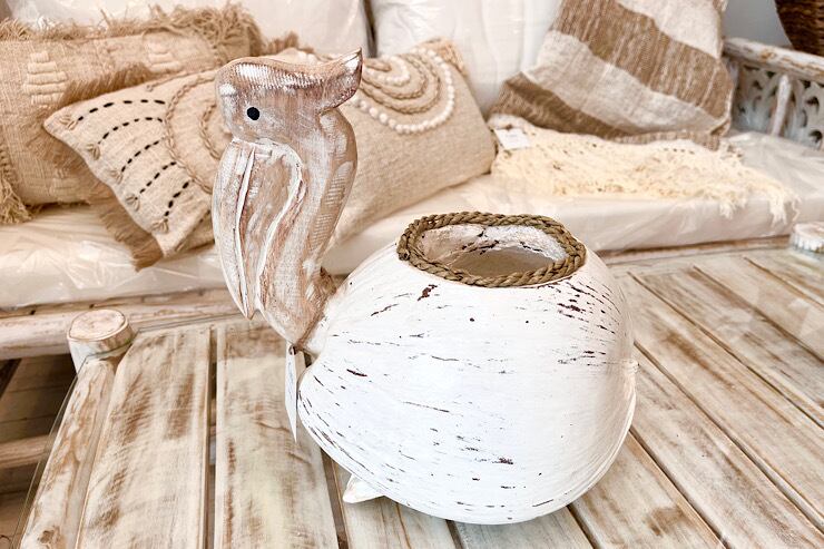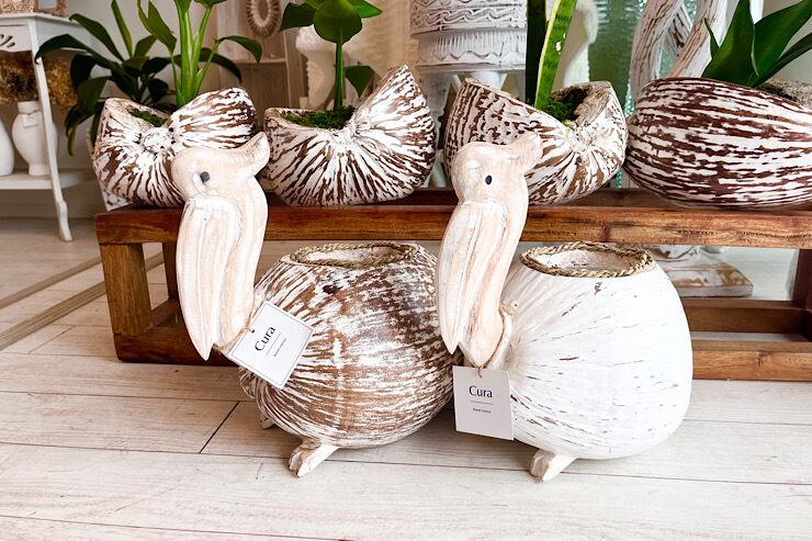 ココナッツで作られたペリカンモチーフのフラワーポットです。
